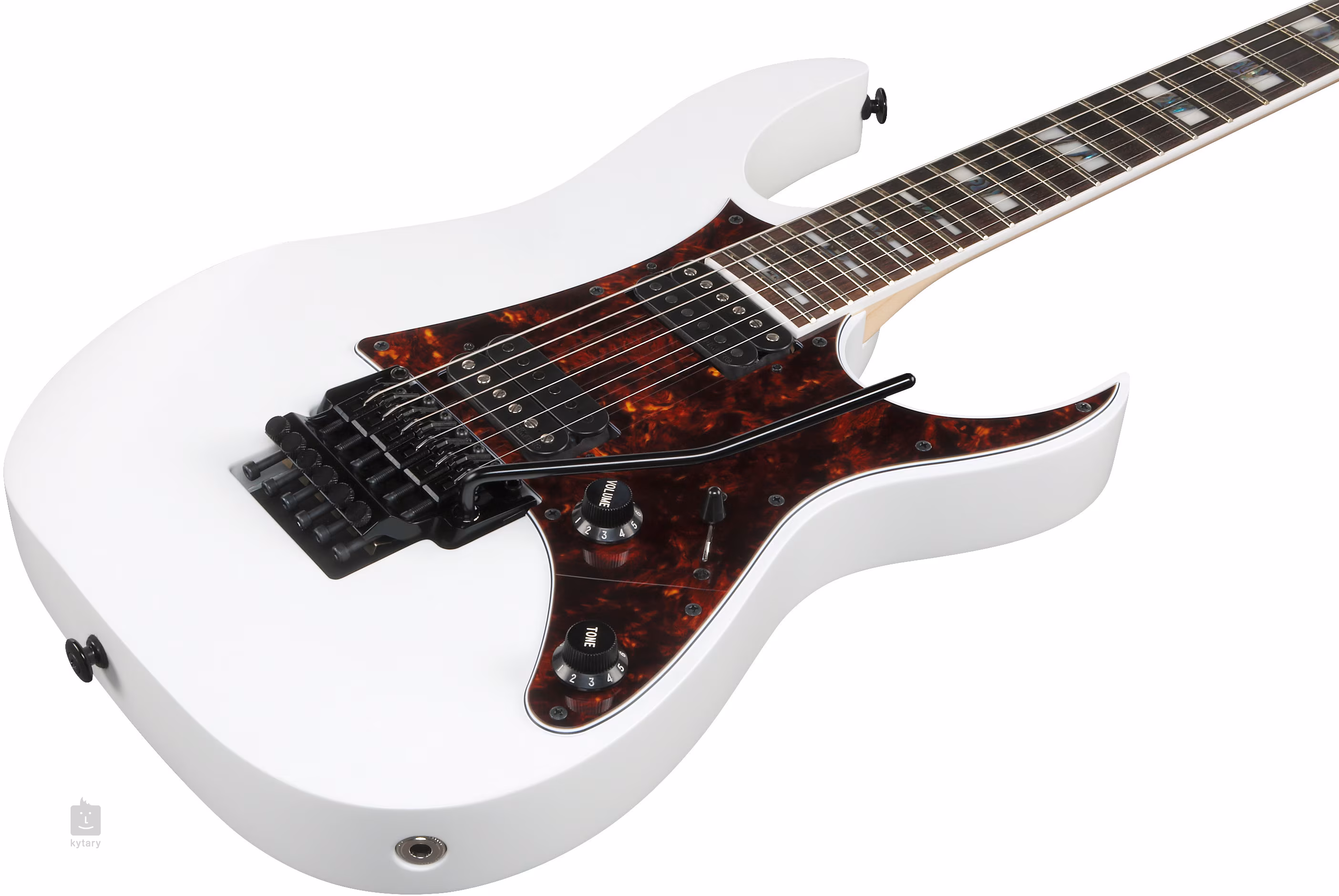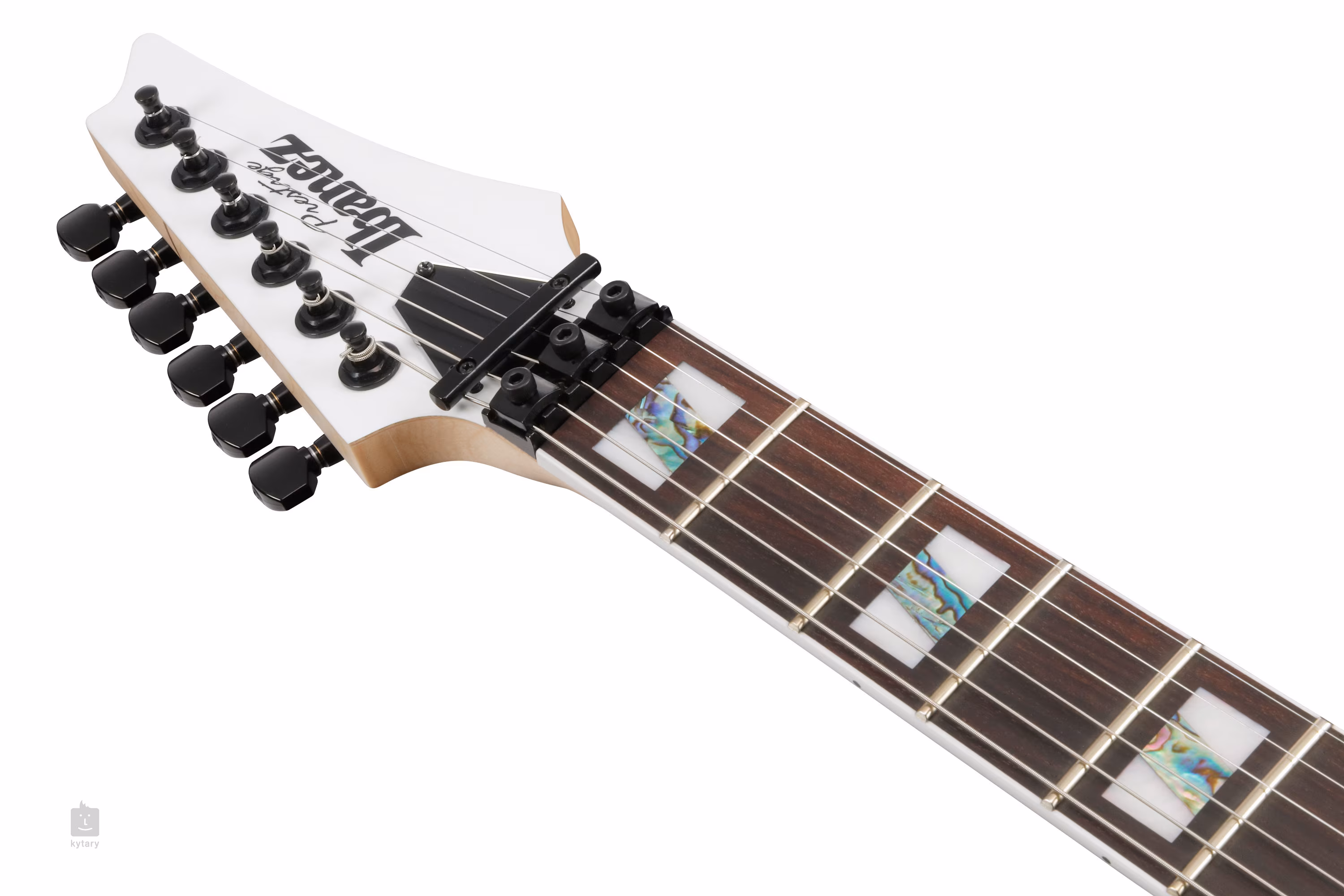 Jasanové tělo elektrické kytary RG653DX-WHF zdobí lesklý polyesterový lak, barevná úprava White Flat a pickguard z imitace želvoviny. K rychlému krku z pěti kusů javoru a ořechu s profilem Super Wizard HP je přilepen palisandrový hmatník osazený čtyřiadvaceti pražci velikosti Jumbo. Orientaci na hmatníku usnadňují polohové bloky z perleti (Abalone) a imitace perleti.
