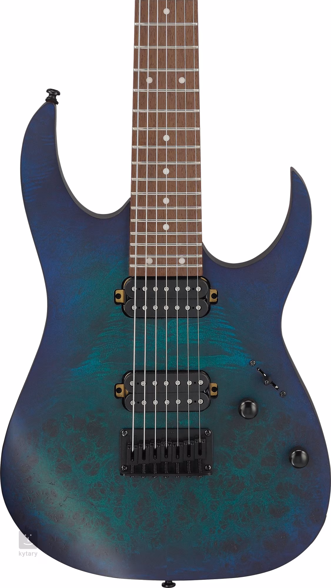 Tělo sedmistrunné kytary RG7421PB-SBF ze dřeva meranti zdobí vrchní dýha z obláčkového javoru. K rychlému javorovému krku s profilem Wizard II-7 je přilepen hmatník z jatoby osazený čtyřiadvaceti pražci velikosti Jumbo. Orientaci na hmatníku usnadňují bílé poziční tečky.