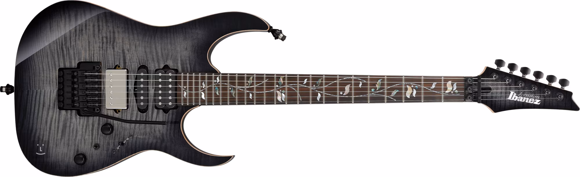 Lehké komorované olšové tělo elektrické kytary RG8870 Black Rutile zdobí 4 mm silný top z fládrovaného javoru kvality AAA. K rychlému krku z pěti kusů javoru a wenge s profilem Super Wizard AS je přilepen hmatník z ebenu makassar osazený čtyřiadvaceti pražci velikosti Jumbo.