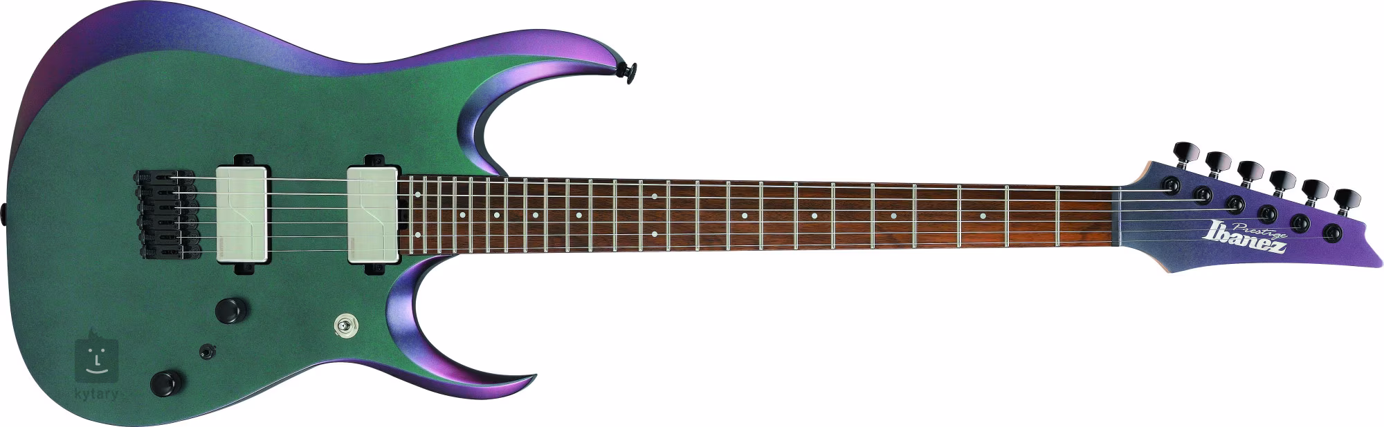 Lipové tělo barytonové kytary RGD3121 Polar Lights zdobí efektní finiš Polar Lights Flat. Ke krku složeného z pěti kusů javoru a wenge je přilepen hmatník z ebenu makassar osazený čtyřiadvaceti pražci velikosti Jumbo. Upravené hrany pražců vám poskytnou optimální herní komfort (Prestige fret edge treatment). Snadnou orientaci na hmatníku i v temných podsvícených prostředích zaručují luminiscenční tečky.
