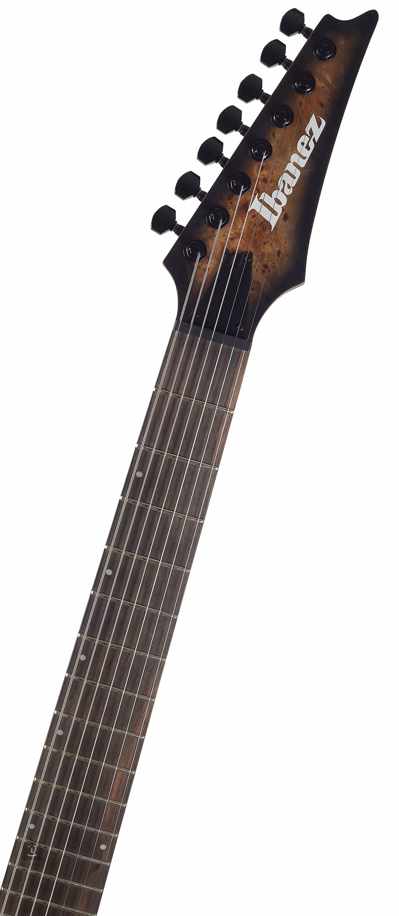 Tělo sedmistrunné kytary RGD71ALPA-CKF je zhotoveno ze dřeva nyatoh, vrstveného jasanu a efektní vrchní dýhy z kořenice topolu. Ke krku složeného z pěti kusů ořechu a panga panga je přilepen hmatník z ebenu makassar osazený čtyřiadvaceti kryogenicky ošetřenými pražci velikosti Jumbo. Orientaci na hmatníku usnadňují bílé offset poziční tečky a luminiscenční značky na boku, díky kterým budete mít perfektní přehled o pohybu na hmatníku i v temných podsvícených prostředích pódií. Díky delší menzuře (673 mm) si kytara hravě poradí s výraznějším podladěním.