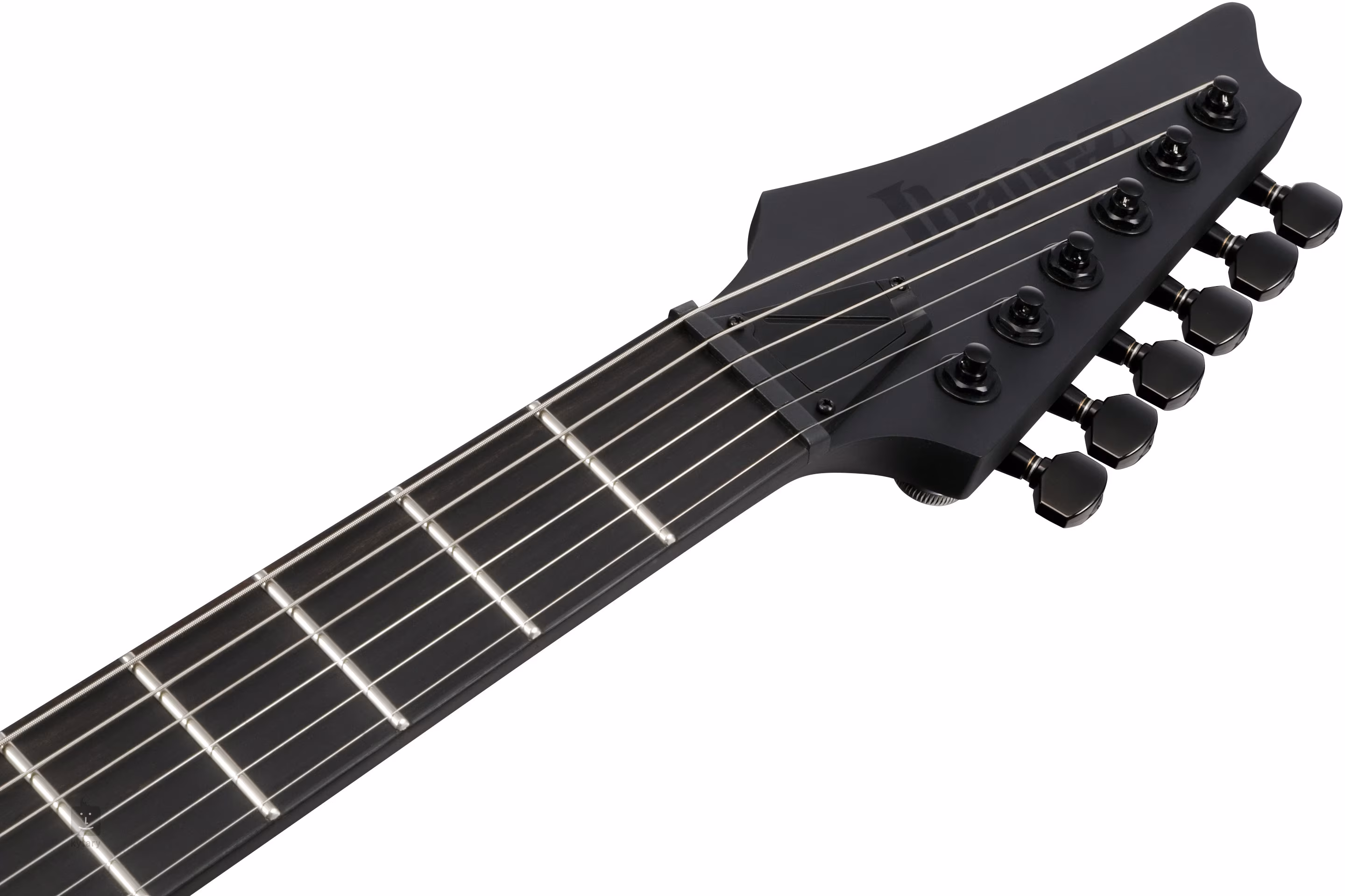 Tělo kytary Iron Label S721RB Black Flat v Super ST S (Saber) designu je zhotoveno ze dřeva okoumé. K přišroubovanému krku z pěti kusů javoru a ořechu s rychlým Wizard III profilem je přilepen ebenový hmatník osazený čtyřiadvaceti pražci velikosti Jumbo. S orientací i za šera vám pomůžou boční luminiscenční tečky.