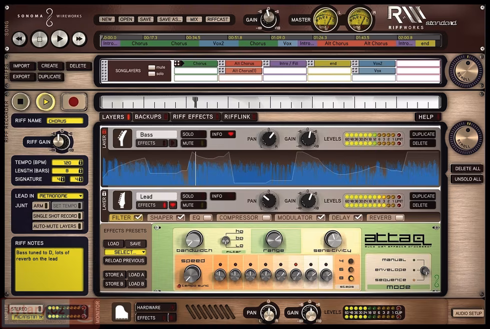 IK Multimedia oznamuje celosvětovou distribuci Sonom Wire Works’ RiffWorks Standard - aplikace pro záznam kytary, která Vám umožní efektivní produkci skladeb a jamování on-line. RiffWorks Standard Vám umožní vytvářet vlastní skladby jednoduchým použitím prostředí založeném na riffech, které inspirativně experimentují se strukturou skladby. V okamžiku Vaší inspirace můžete zaznamenat myšlenku pouze nastavením tempa a záznamem jednoduchého brnkání na Vaší kytaru. Stopy se vytvoří automaticky, jak hrajete. Můžete tedy vytvořit více stop nebo vrstvení bez nutnosti zastavování.