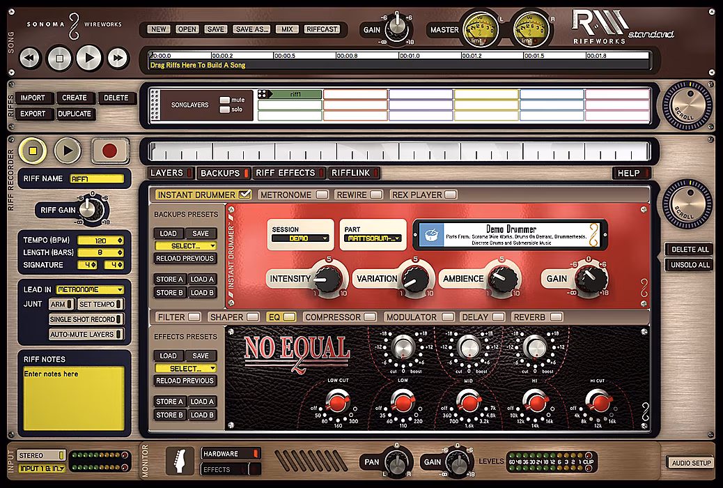 InstantDrummer Vám pomůže snadno přidat bicí k Vašim partům kytary a basy. S osmi různými InstantDrummery, které lze volně použít, jež RiffWorks Standard obsahuje (a další jsou k dispozici on-line), můžete vybrat groove, nastavit tempo a hrát, zatímco studiově zaznamenaná plnohodnotná sada bicích, hraje perfektní doprovod.