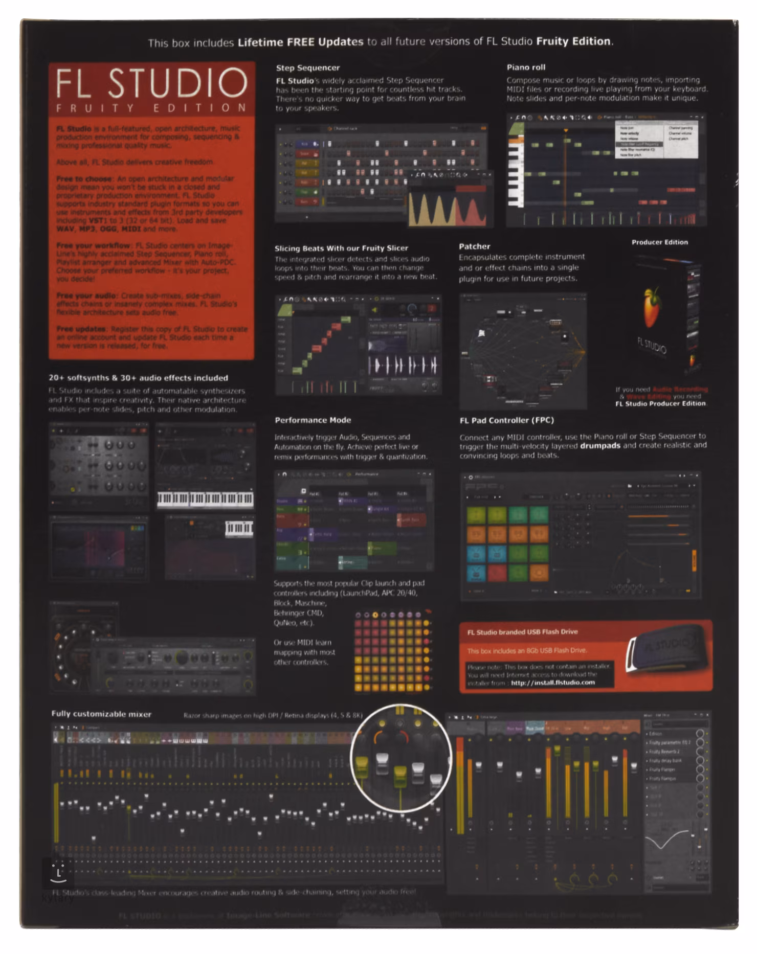 FL Studio má otevřenou architekturu pro vytváření projektů a hudební inspiraci. Není potřeba jiný software, vše budete schopni vytvořit v jediném uceleném systému. S mnoha integrovanými pluginy lze připravit i masterovat kompletní skladby. Formát výstupu mohou být: WAV, MP3, OGG, MIDI, ZIP nebo nativní formát projektu (.FLP).