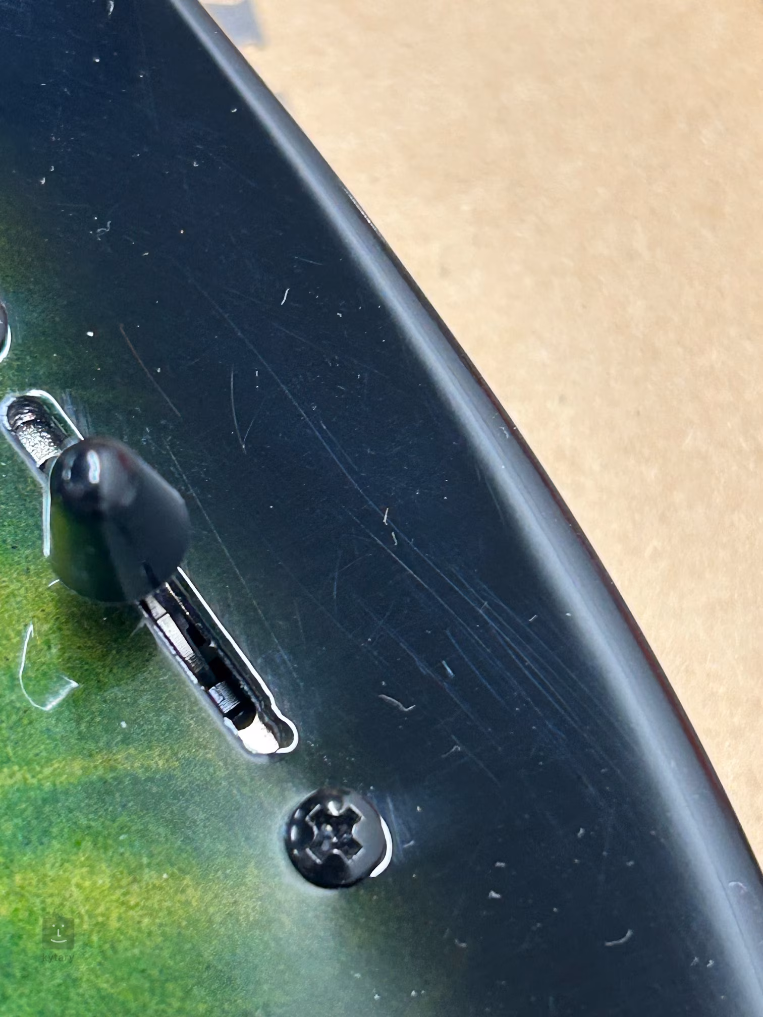 Topolové tělo kytary JS32 Dinky Arch Top HT AMR TGB s klenutým topem (Archtop) zdobí dýha z obláčkového javoru s efektní kresbou dřeva podpořenou barevnou úpravou Transparent Green Burst. K přišroubovanému javorovému krku zpevněnému grafitovou výztuží je přilepen hmatník ze dřeva amaranth (purpleheart) osazený čtyřiadvaceti pražci velikosti Jumbo. Jeho rádius se směrem k tělu zplošťuje – umožňuje tak jak pohodlné hraní riffů u nultého pražce, tak i komfortní ultra rychlý shred ve vyšších polohách. Orientaci na hmatníku usnadňují polohové značky z imitace perleti typu Sharkfin (žraločí ploutve).