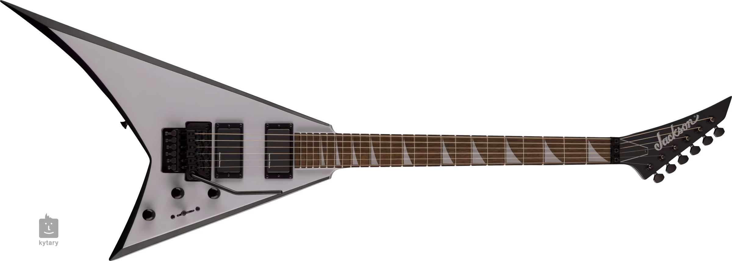 Dva humbuckery Blackouts značky Seymour Duncan s vysokým výstupním signálem poskytují kytaře šťavnatý zvuk a potřebnou artikulaci pro hraní ostře sekaných riffů, ultra rychlého shredu i zpěvných sól. Ke zvukovým úpravám slouží dva potenciometry hlasitosti (pro každý snímač zvlášť), tónová clona a třípolohový přepínač snímačů. Struny jsou uchyceny ve firemních die-cast ladicích mechanikách a dvojzvratném tremolu Floyd Rose Special, s jehož pomocí zpestříte hru působivými zvukovými efekty. Řádně ostrý a špičatý tvar těla zvýrazňuje neméně odvážný design s černými zkosenými hranami těla a barevná úprava těla, krku a polohových značek v šedém provedení.