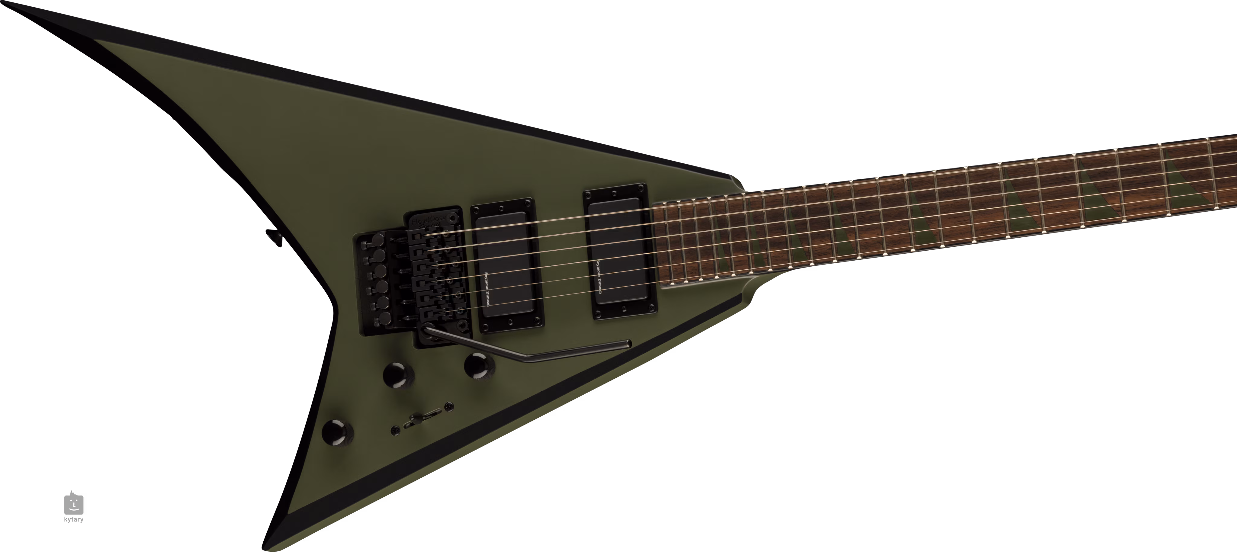 Dva humbuckery Blackouts značky Seymour Duncan s vysokým výstupním signálem poskytují kytaře šťavnatý zvuk a potřebnou artikulaci pro hraní ostře sekaných riffů, ultra rychlého shredu i zpěvných sól. Ke zvukovým úpravám slouží dva potenciometry hlasitosti (pro každý snímač zvlášť), tónová clona a třípolohový přepínač snímačů. Struny jsou uchyceny ve firemních die-cast ladicích mechanikách a dvojzvratném tremolu Floyd Rose Special, s jehož pomocí zpestříte hru působivými zvukovými efekty. Řádně ostrý a špičatý tvar těla zvýrazňuje neméně odvážný design s černými zkosenými hranami těla a barevná úprava těla, krku, hlavy a polohových značek v provedení Matte Army Drab.