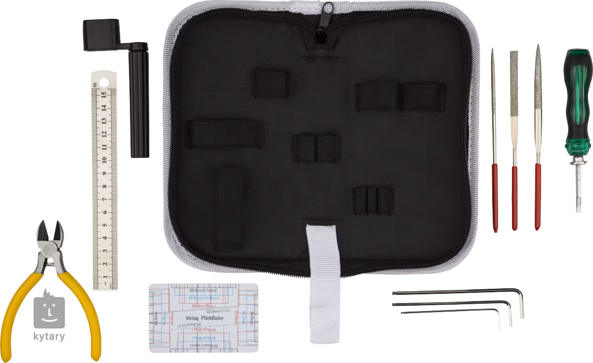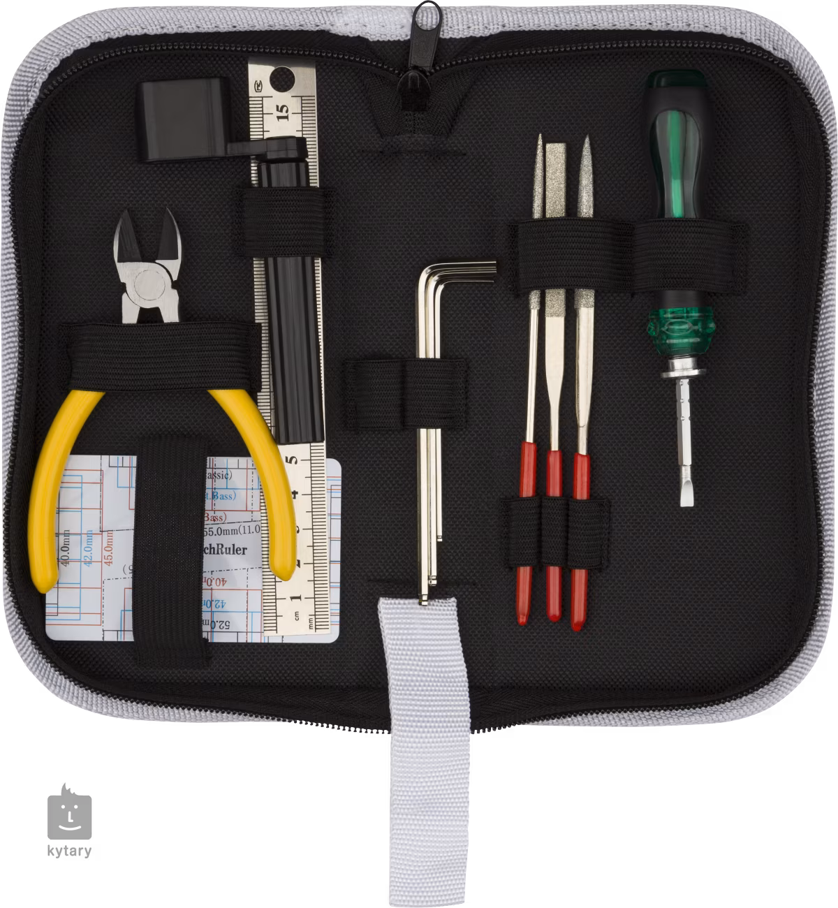 V této praktické sadě naleznete vše, co budete potřebovat k základnímu seřízení a údržbě svého nástroje. Sada obsahuje kleště a navíječku na struny, sadu pravítek, šroubovák, hexagonální klíče a sadu pilníků. Všechny nástroje jsou uloženy v tašce na zip, což umožní pohodlný přenos a skladování.