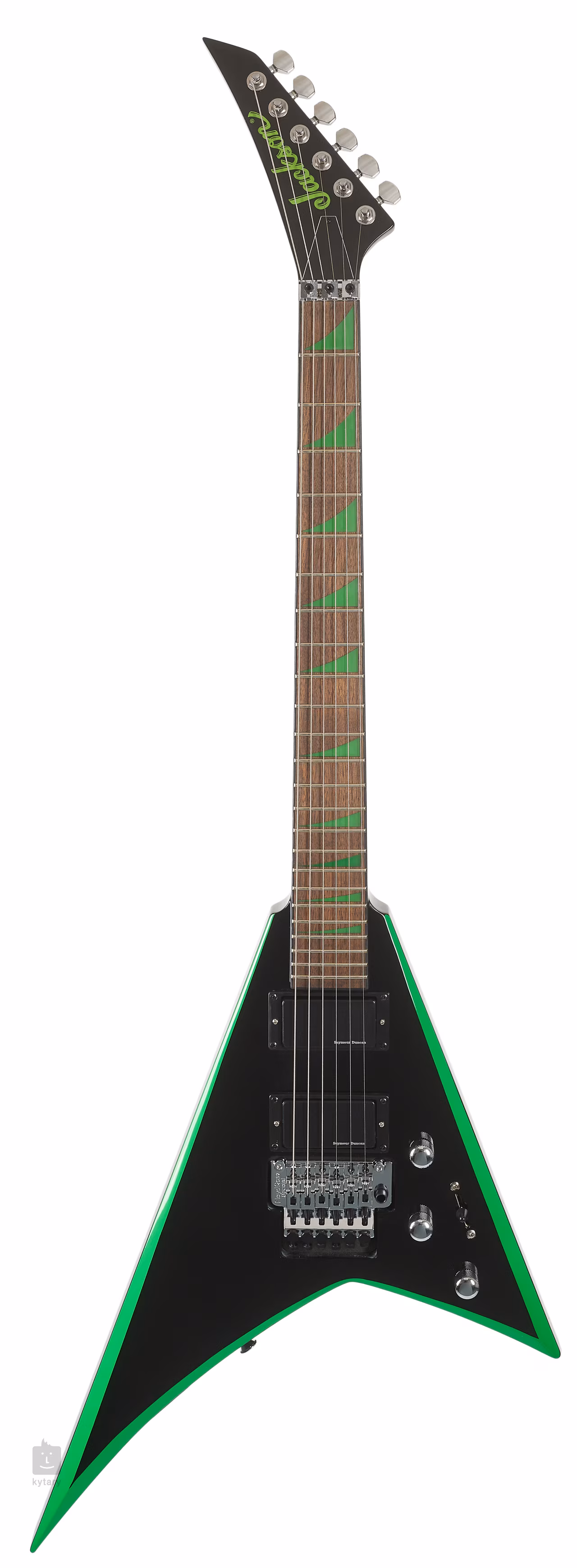 Dva humbuckery Blackouts značky Seymour Duncan s vysokým výstupním signálem poskytují kytaře šťavnatý zvuk a potřebnou artikulaci pro hraní ostře sekaných riffů, ultra rychlého shredu i zpěvných sól. Ke zvukovým úpravám slouží dva potenciometry hlasitosti (pro každý snímač zvlášť), tónová clona a třípolohový přepínač snímačů. Struny jsou uchyceny ve firemních Die-Cast ladících mechanikách a dvojzvratném tremolu Floyd Rose, s jehož pomocí zpestříte hru působivými zvukovými efekty. Řádně ostrý a špičatý tvar těla zvýrazňuje neméně odvážný design se zelenými zkosenými hranami těla, polohovými značkami , logem Jackson na hlavě kytary a chromovaný hardware.