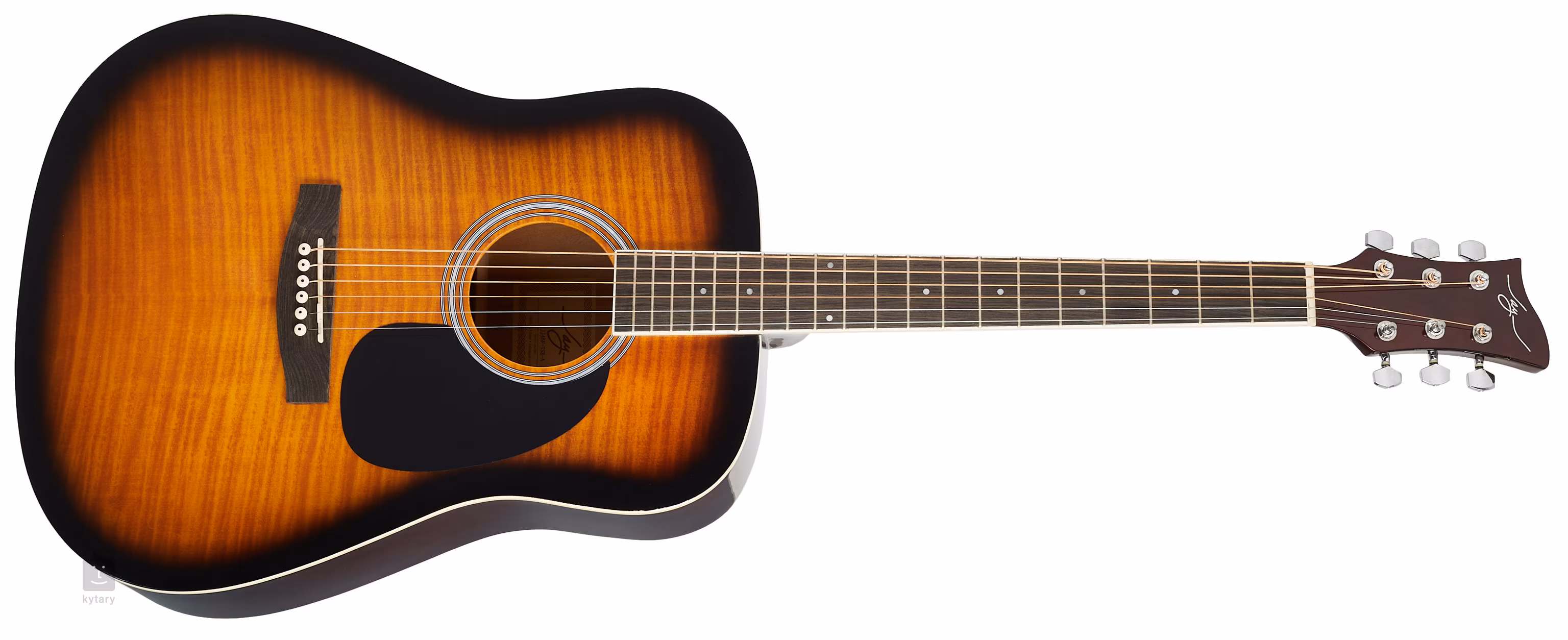 Struny jsou uchyceny v chromovaných Die-Cast ladících mechanikách a kobylce z kompozitu. Stylový vzhled kytary podtrhují tradiční prvky v podobě obvodové lemovky těla, rozety a pickguardu.