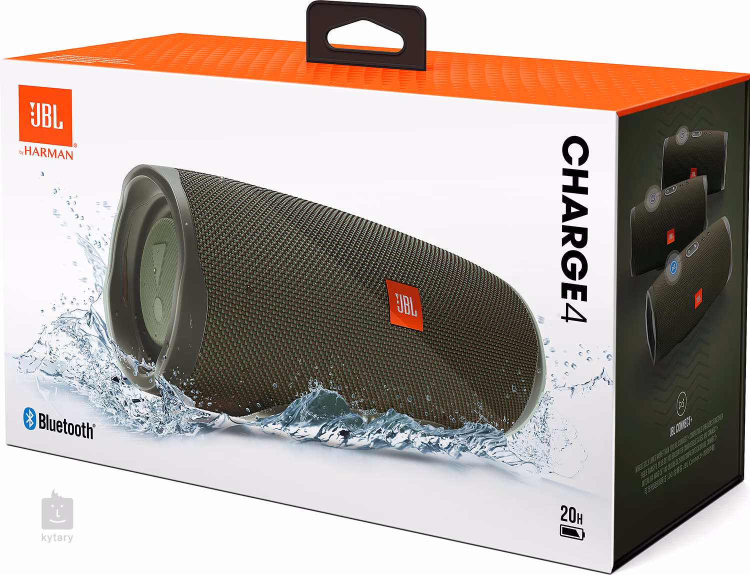 Plnost zvuku podporují dva pasivní vyzařovače rozmístěné po stranách. Reprobox lze použít i jako powerbanku, takže se nemůže stát, že by se váš hudební přehrávač vybil. V horní části se nachází zabudovaný ovladač pro bezdrátové připojení vašich zařízení, tlačítko pro rychlé připojení k Siri nebo Google Now, ovládání hlasitosti a tlačítko "Play". JBL Charge 4 můžete spojit až s dvěmi smartphony nebo tablety, pomocí technologie JBL Connect+ reproduktor propojíte se sto dalšími reproduktory vybavenými touto technologií.