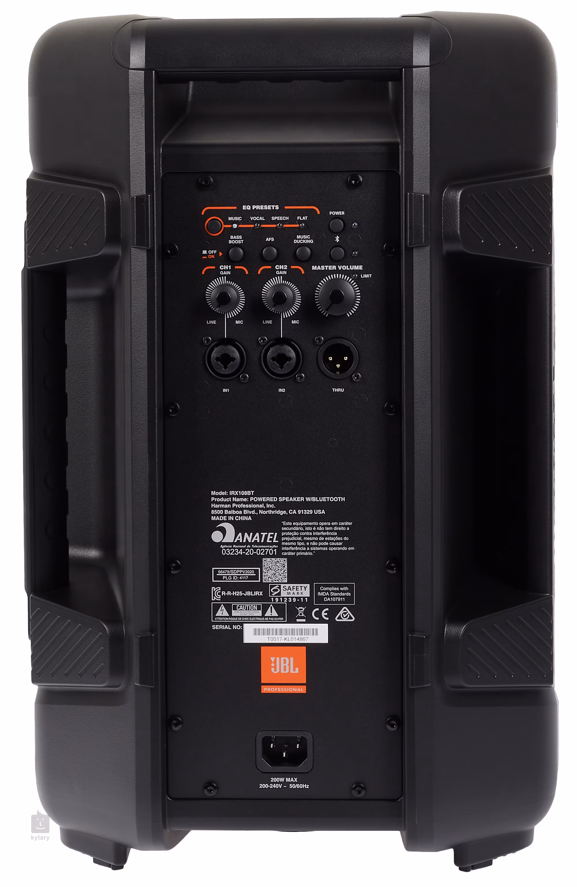 Uvnitř odlehčené konstrukce z odolného plastu se ukrývá 8“ basový reproduktor s maximálním výkonem až 1300 W, ten je potom chráněn robustní ocelovou mřížkou proti poškození. Zadní panel obsahuje dva kombinované XLR/Jack konektory se separovanými ovladači Volume pro připojení mikrofonů, bezdrátových systémů nebo hudebních nástrojů. Dále zde naleznete XLR výstup pro připojení do dalšího PA, tlačítka pro spuštění automatického potlačení zpětné vazby, ztlumení hudby nebo pro firmu JBL typického Bass Boost.