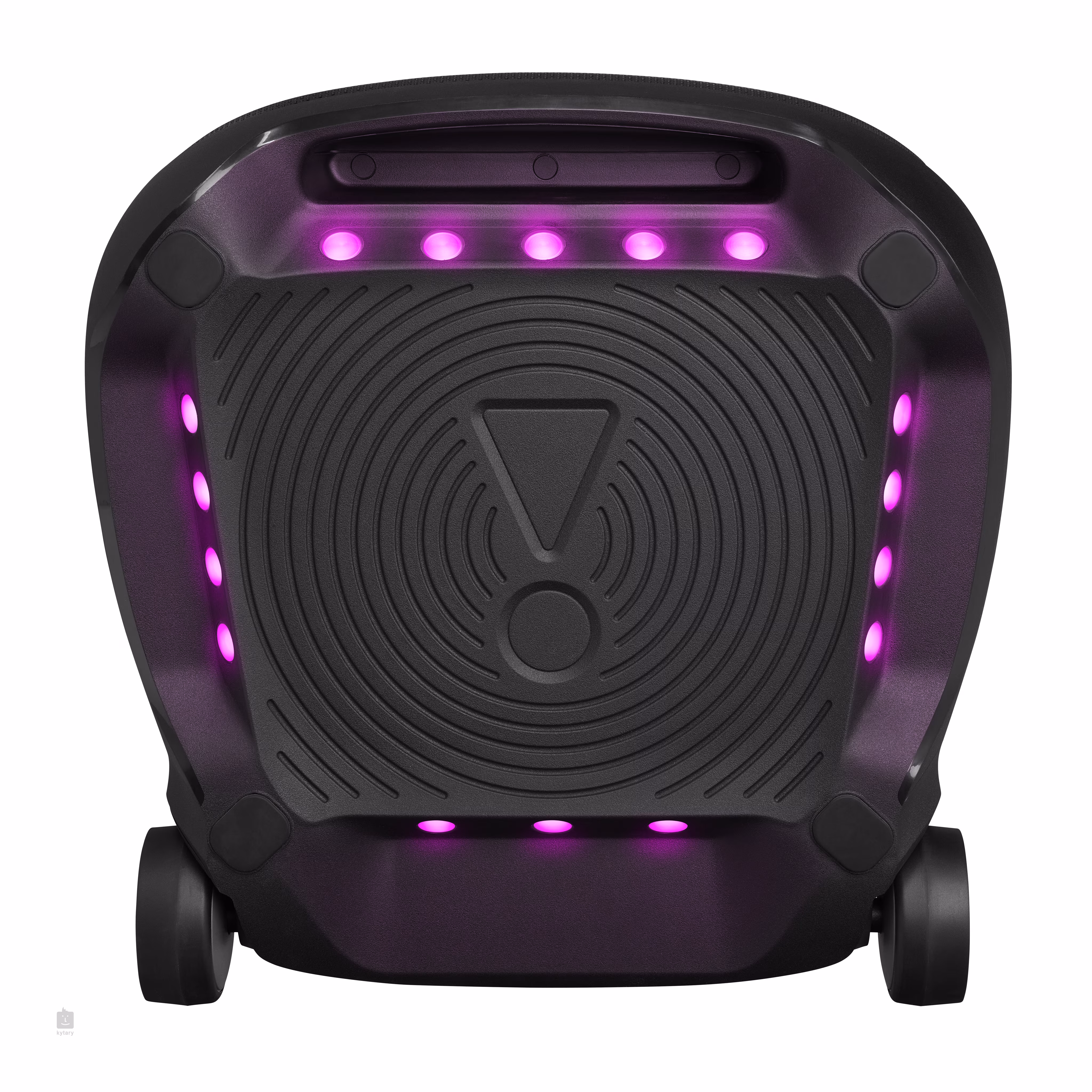Vaše party může být stále v pohybu díky širokým robustním kolečkům a pohodlné rukojeti, se kterými přemístíte i tento velký reproduktor překvapivě snadno. Jednoduché, ale efektivní uspořádání kabelů navíc zajistí, že vám kabely nebudou nikdy překážet.