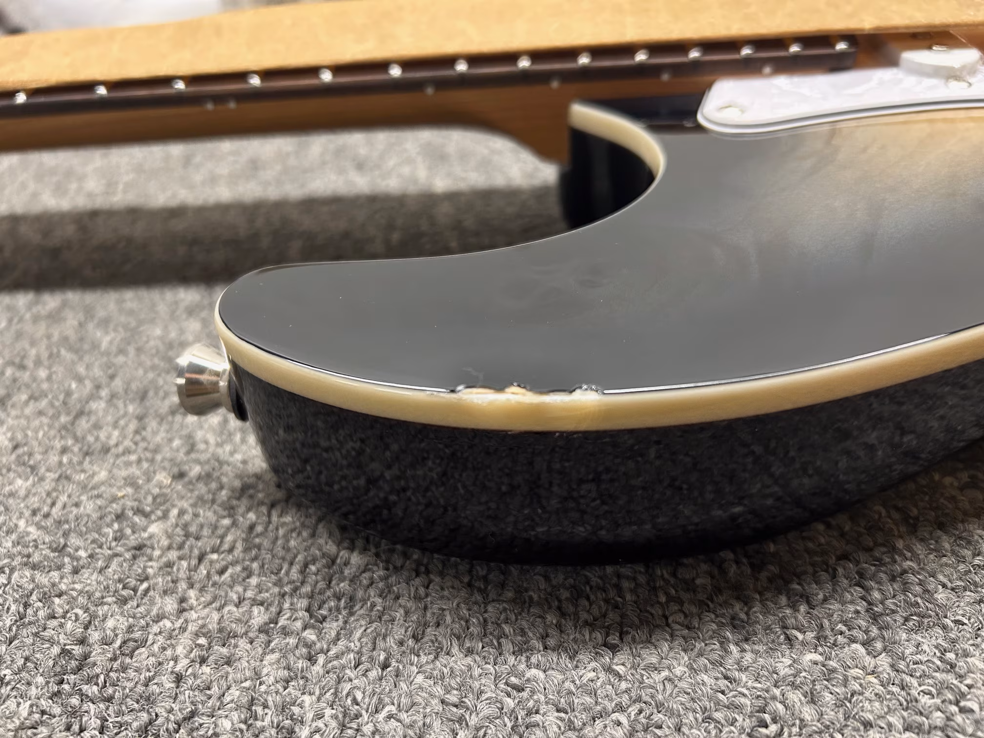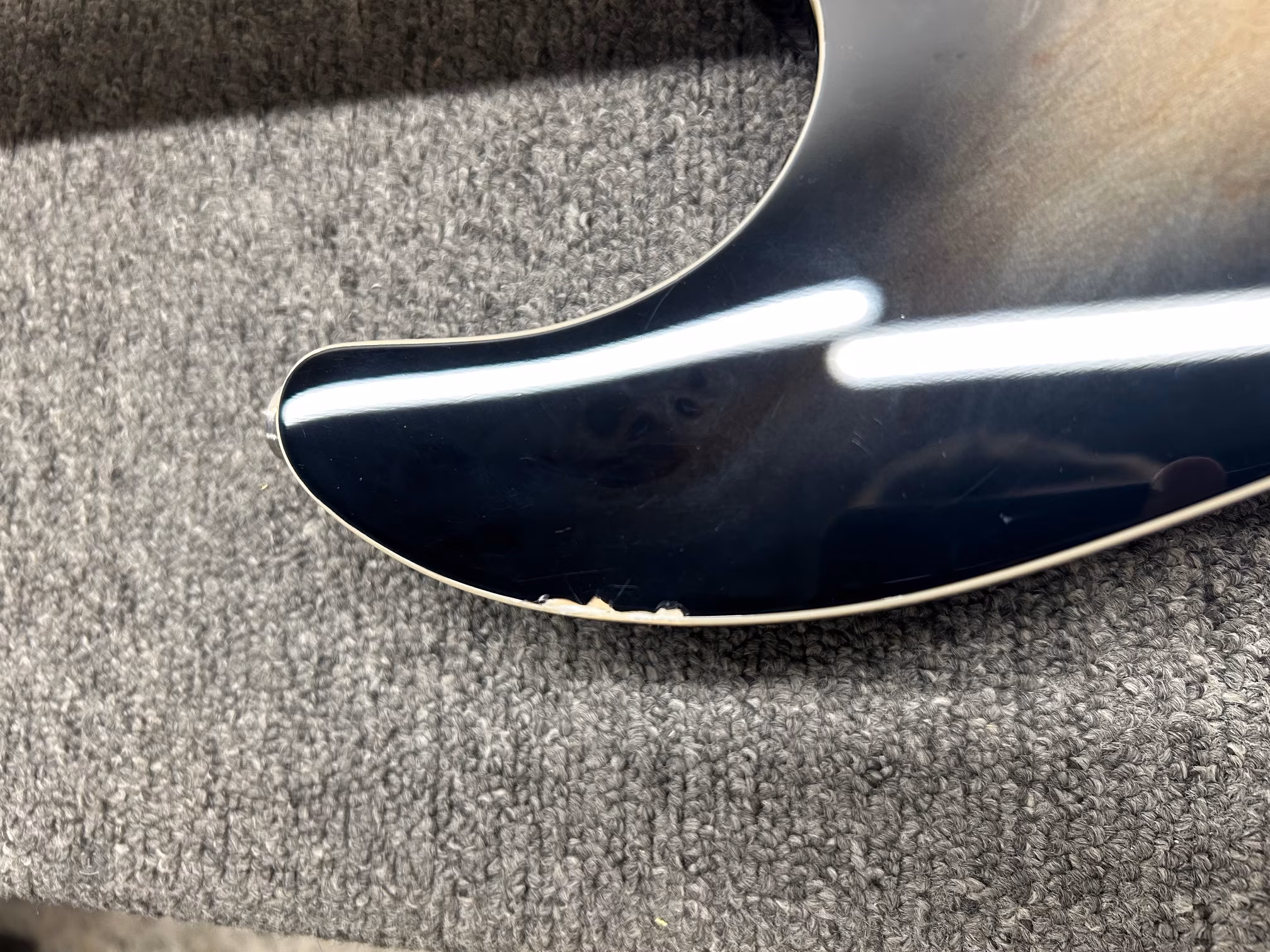 Poškozený lak na hraně těla nástroje (viz foto). Jinak je nástroj nový a v pořádku.