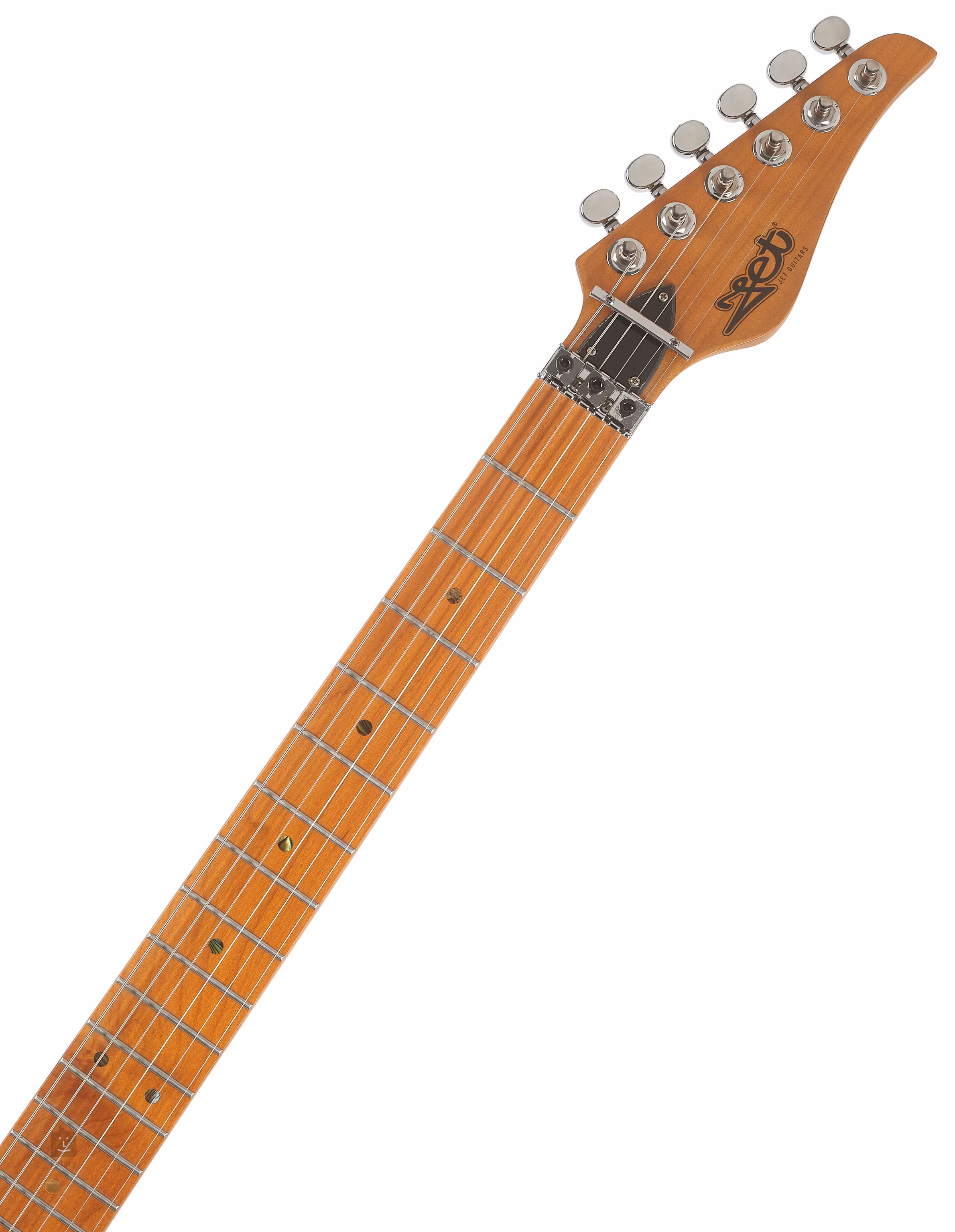 Mahagonové tělo nástroje zdobí efektní dýha z fládrovaného javoru. K přišroubovanému krku z tepelně upraveného (roasted) kanadského javoru je přilepen ebenový hmatník (mixed ebony) osazený dvaadvaceti pražci.