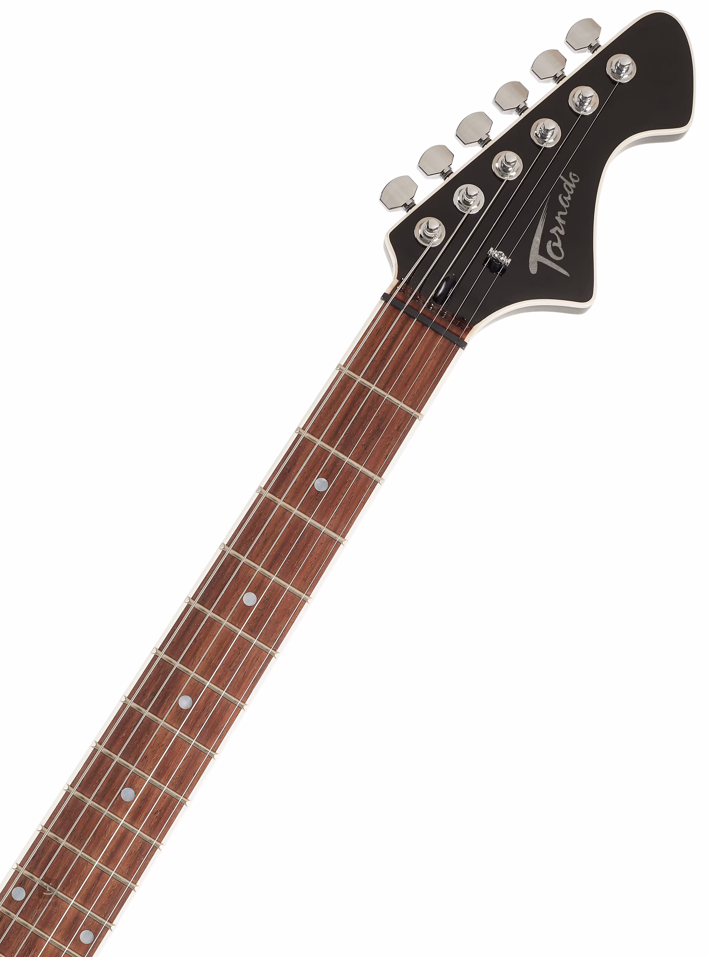 Pololubová kytara Tornado II SB AM CH RW BK nabízí javorový korpus s javorovým topem a lesklou úpravou Solid Black Gloss. K javorovému krku s pohodlným “C” profilem je přilepen palisandrový hmatník osazený dvaadvaceti pražci velikosti Medium Jumbo. Orientaci na hmatníku usnadňují bílé poziční tečky.