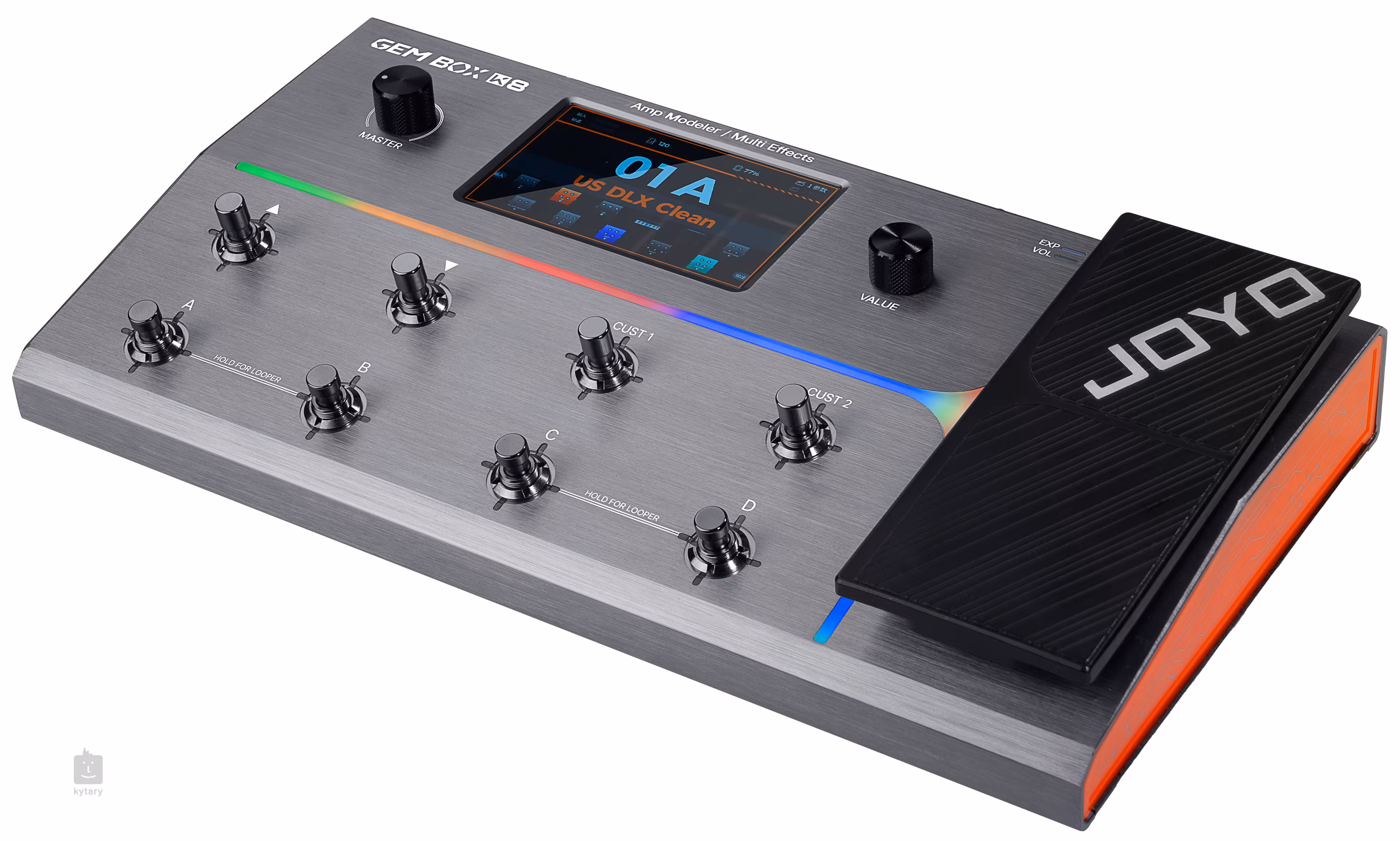 Kytarový multiefekt a amp simulátor Gem Box K8 od společnosti Joyo je vybaven duálním DSP procesorem a nejmodernějšími algoritmy pro vytváření nekonečných zvukových možností. Přístroj je díky své výbavě schopen replikovat libovolný efekt nebo aparát a zachytit i ty nejmenší nuance jeho zvuku. V krabičce najdete celkem 11 továrních efektových modulů, přes 160 typů efektů a 400 paměťových slotů pro uložení vašich presetů. Disponuje také looperem s 60 vteřinami nahrávacího času, integrovanou ladičkou a 90 bicími schématy, které lze s looperem synchronizovat. Nechybí ani 50 slotů pro import IR třetích stran. Zkrátka vše, co potřebujete, abyste mohli nasimulovat celý kytarový rig! Ideální pro živé hraní, nahrávání i domácí cvičení.