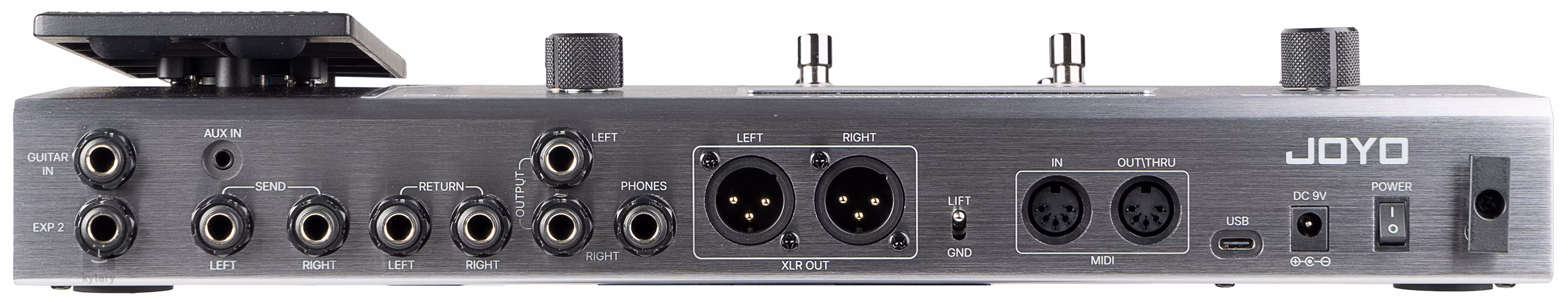 Zadní panel poskytuje bohaté možnosti konektivity. K dispozici je zde kromě nástrojového vstupu a stereo výstupů (2x Jack 6,3 mm, 2x XLR) také možnost zapojení stereo efektové smyčky (2x Send, 2x Return), Aux in pro přehrávání externích zdrojů zvuku, výstup pro sluchátka, vstup pro externí expression pedál, MIDI konektivita pro integraci různých MIDI zařízení a USB rozhraní pro import/export zvuků a presetů, aktualizaci firmware a propojení s DAW. Díky těmto možnostem můžete zařízení připojit k libovolnému kytarovému aparátu nebo přímo PA systému. Můžete jej využít také jako zvukovou kartu pro kvalitní nahrávání nebo jako sluchátkový zesilovač pro domácí cvičení.
