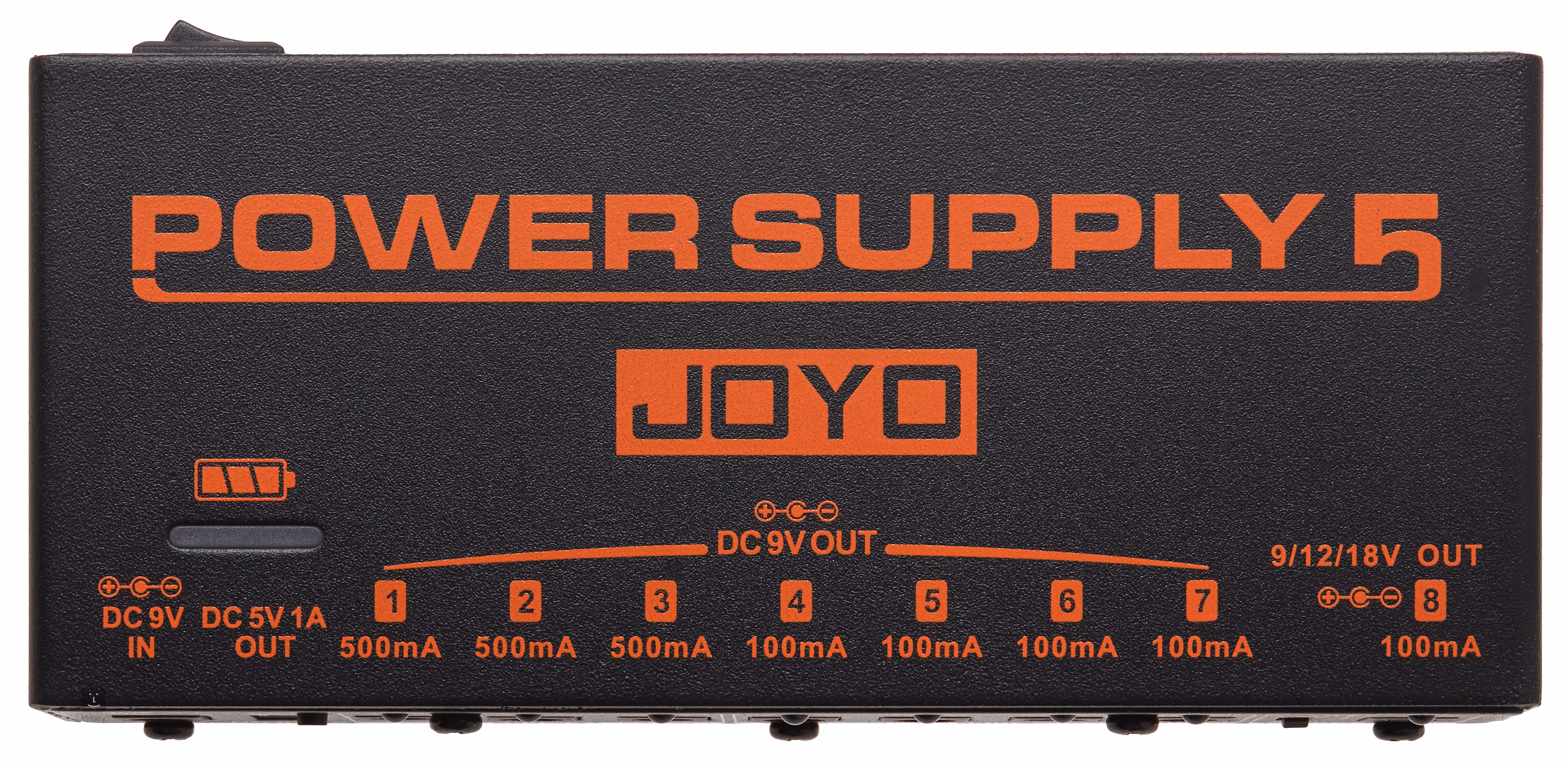 JP-05 je další z řady kytarových multiadaptérů značky Joyo. Nabízí celkově osm výstupů pro vaše kytarové efekty, konkrétně sedm 9V výstupů (3x 500 mA, 4x 100 mA) a jeden výstup s volitelným napětím 9, 12 nebo 18 V (100 mA). Pomocí USB portu můžete navíc napájet USB zařízení či dobíjet váš telefon. K napájení samotného multiadaptéru využijete 9V DC adaptér (Center Negative), který je součástí balení. Díky provozu na baterie se však obejdete i bez zdroje – zabudované lithiové baterie zvládnou několik hodin plynulého provozu (až sedm hodin při použití analogových pedálů a přibližně dvě hodiny při zapojení digitálních pedálů). O stavu baterie informuje indikační LED dioda.