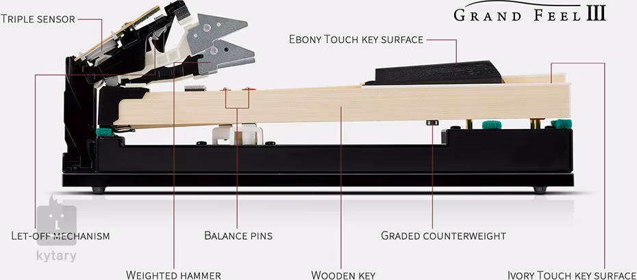 Přesnou interpretaci skladeb zajistí prémiová klaviatura Grand Feel III s dřevěnými klávesami ze slonoviny a ebenu, která disponuje třemi senzory pro naprosto přesné snímání každé klávesy, let-off simulací a také závažím, díky němuž mají spodní klávesy, podobně jako na akustickém pianu, tužší dohmat než klávesy vyššího rejstříku. K dispozici jsou všechny běžné hráčské režimy jako split mode, dual mode, four hand mode a další. Využít můžete také funkci transpozice a ladění.