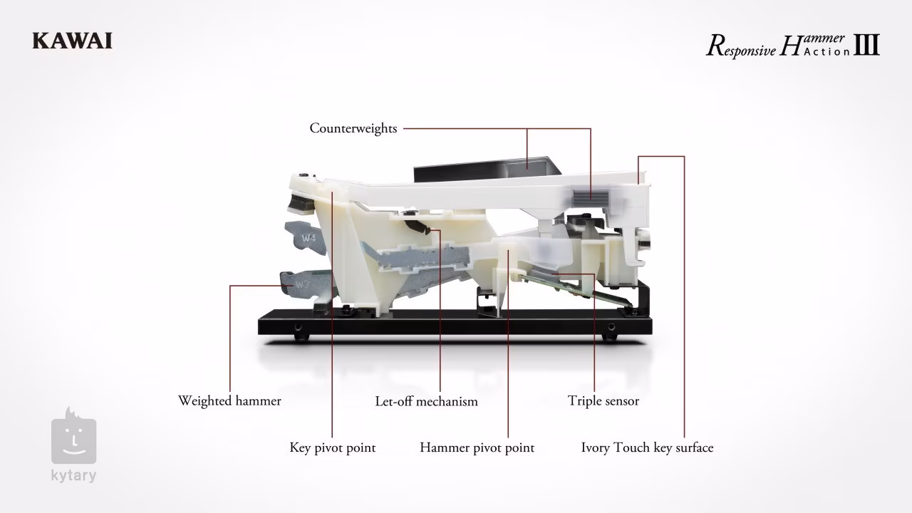 Dynamická klaviatura Responsive Hammer III se třemi integrovanými senzory velmi věrně napodobuje pocit ze hry na akustické piano, včetně různého vyvážení nižších a vyšších kláves. Každá klávesa disponuje hned třemi senzory zvuku a mechanismus let-off věrně napodobuje hraní jemných tónů při „lechtání“ kláves. Vaše staccatová či legátová technika nikdy nezněla přirozeněji. Povrch je vyroben ze syntetické slonoviny, pokud by se tak hráč později rozhodl přejít na akustické piano, rozdíl bude jen minimální.