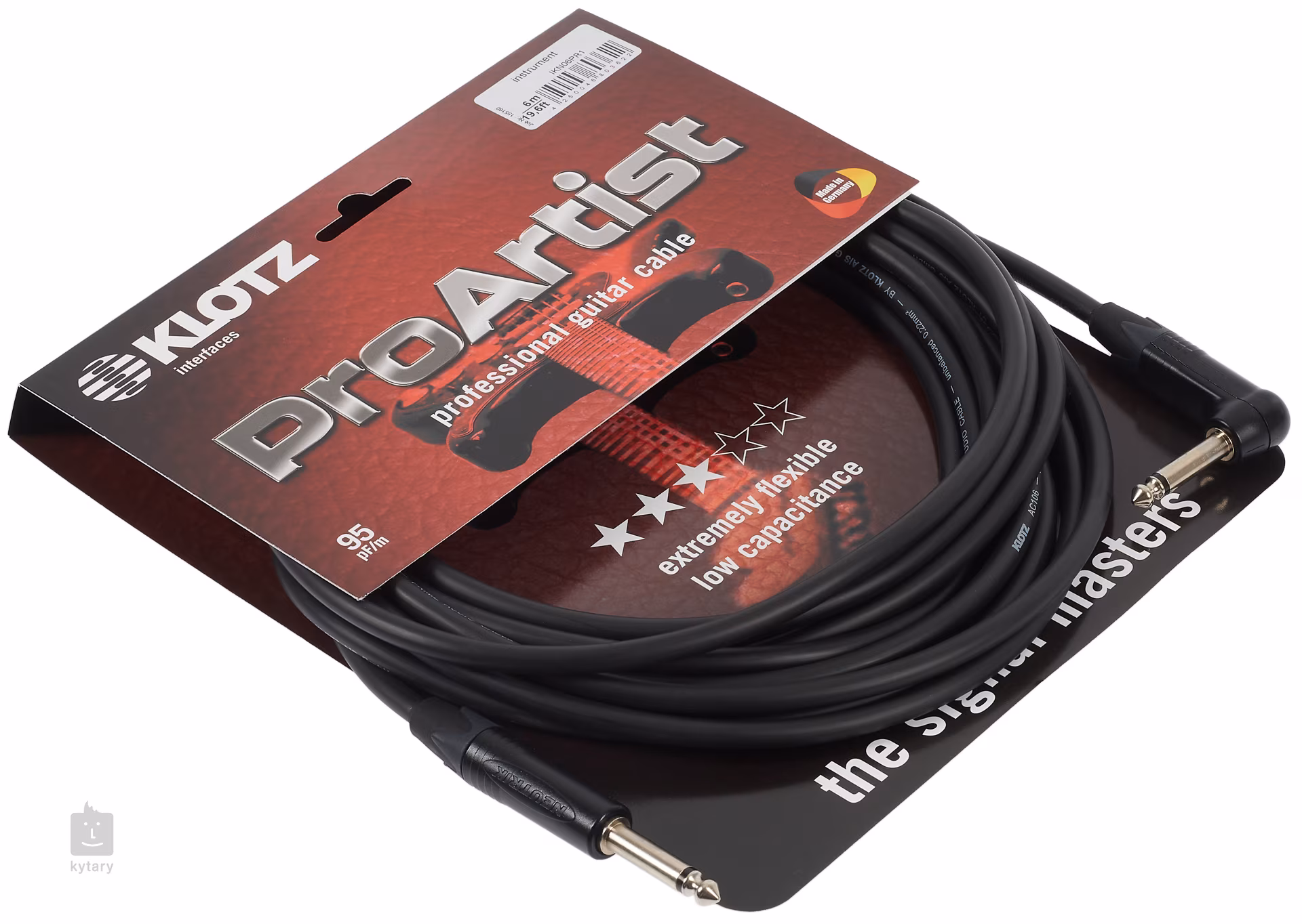 Nástrojové kabely značky Klotz z řady Pro Artist nabízejí kombinaci věrného signálového přenosu, vysoké flexibility a odolnosti. Kvalitní měděné jádro zajišťuje vřelý a bohatý zvuk s minimální kompresí a nízká kapacita 95 pF/m se stará o rychlou odezvu a frekvenčně vyvážený tón. Kabel můžete využít pro zapojení kytary, baskytary nebo jiného mono nástroje. Tento model má jeden rovný a jeden zahnutý konektor. Jeho délka je 6 metrů.