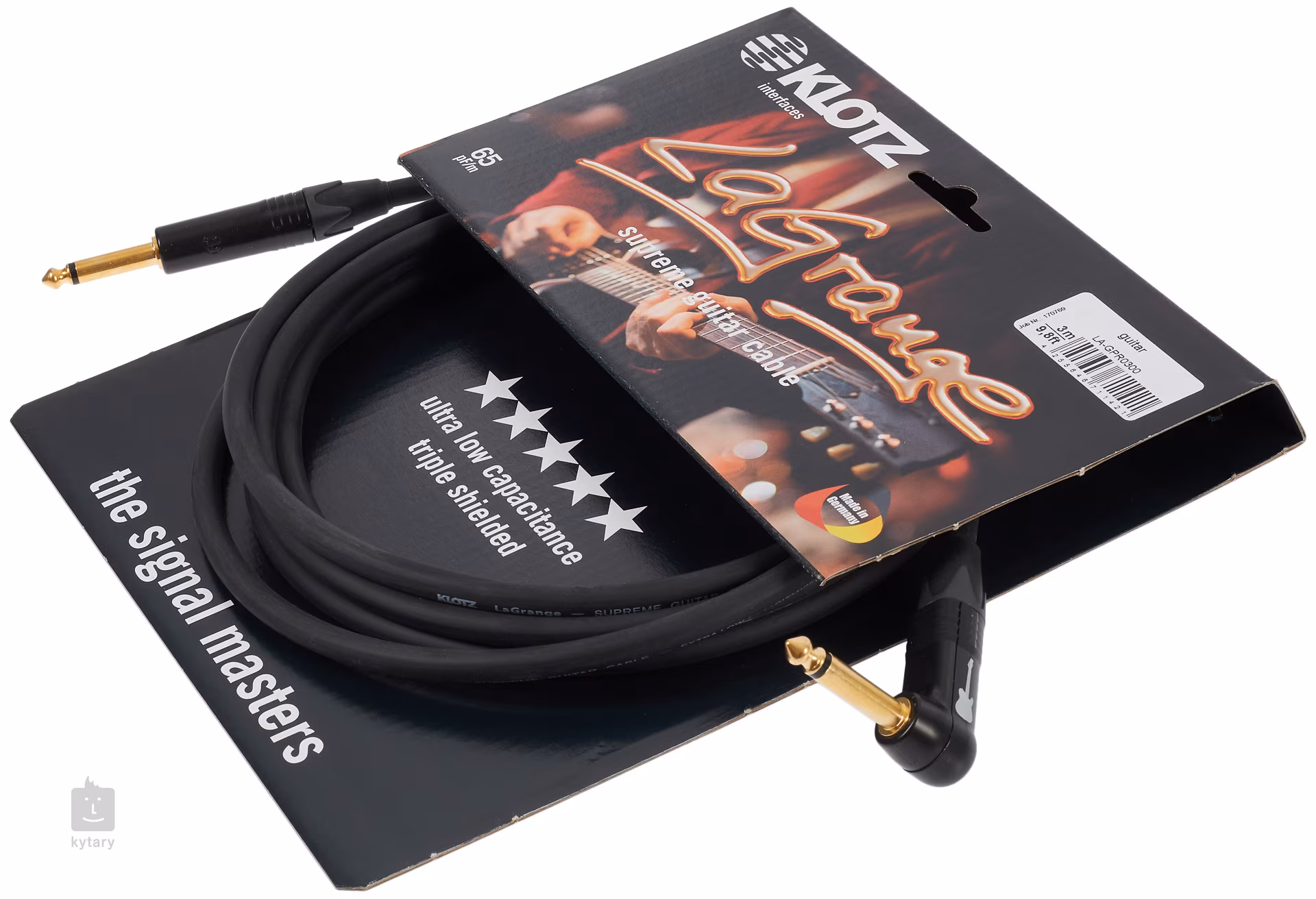 Nástrojové kabely značky Klotz z řady LaGrange jsou na scéně již od roku 1985 a po celou dobu své existence se těší velké oblibě. Jejich velkým lákadlem je blesková odezva, dynamický zvuk a minimální komprese. Ultra nízká kapacita 65 pF/m zajišťuje věrný přenos zvuku a trojité stínění se stará o spolehlivou ochranu proti ruchu a šumu. Vodič v jádru je vyroben z vysoce kvalitní mědi. Výsledkem je čistý, frekvenčně vyvážený zvuk, který ocení i ti nejnáročnější muzikanti. Tento model je vybaven jedním rovným a jedním lomeným konektorem s pozlaceným povrchem. Délka kabelu je 3 metry.