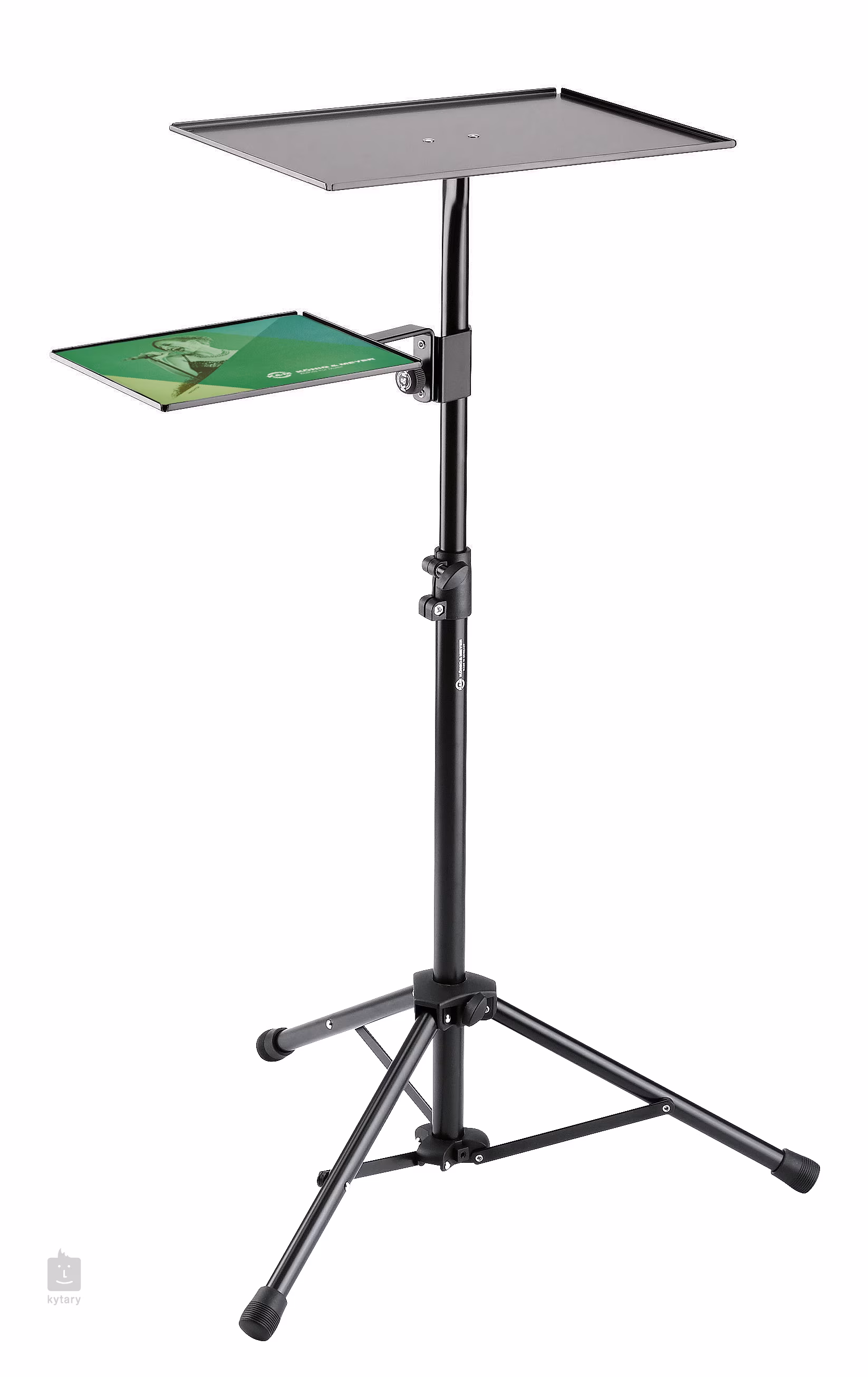 Stojan na laptop od König & Meyer nabízí prostornou odkládací plochu o rozměrech 400 x 290 mm, která je vhodná pro různé velikosti notebooků a podobných zařízení. Odkládací plocha je opatřena gumovými podstavci. Díky V-block konektoru lze stojan snadno odpojit nebo nastavit sklon do libovolné polohy pomocí upínací páky. Součástí je také odnímatelná podložka pro myš o rozměrech 245 x 195 mm.