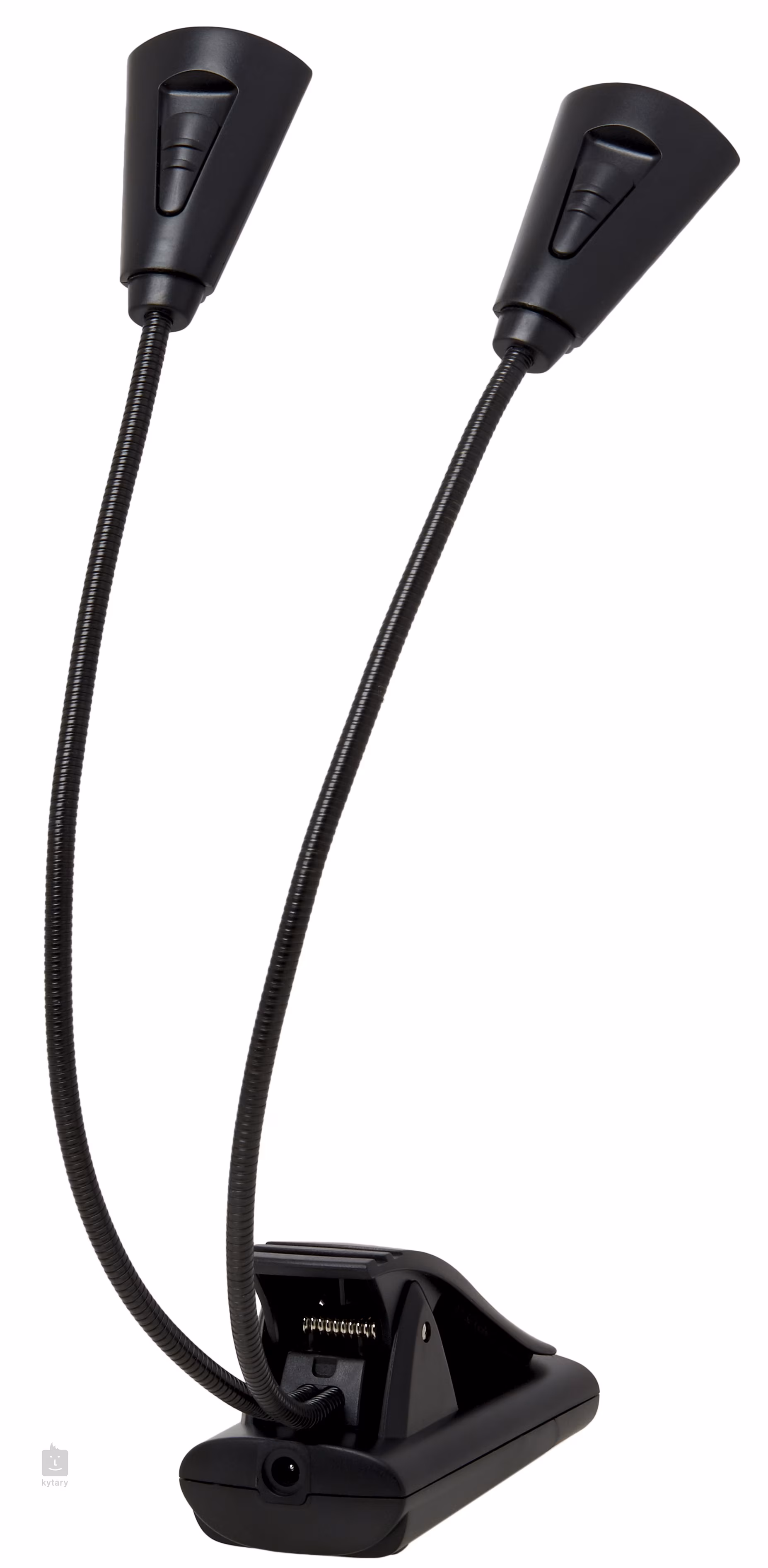 Univerzální lampička pro notový stojan s dvěma krky a dvojicí LED světel, možnost individuálního zapnutí. Životnost LED je okolo 100 000 hodin, flexibilita nastavení je zaručena pomocí husího krku i extra širokého klipsu s rozpětím 25 mm. Lampička díky němu také může stát sama. Napájení probíhá pomocí tří AAA baterií (cca 20 hodin provozu) nebo AC adaptéru (není součástí balení).