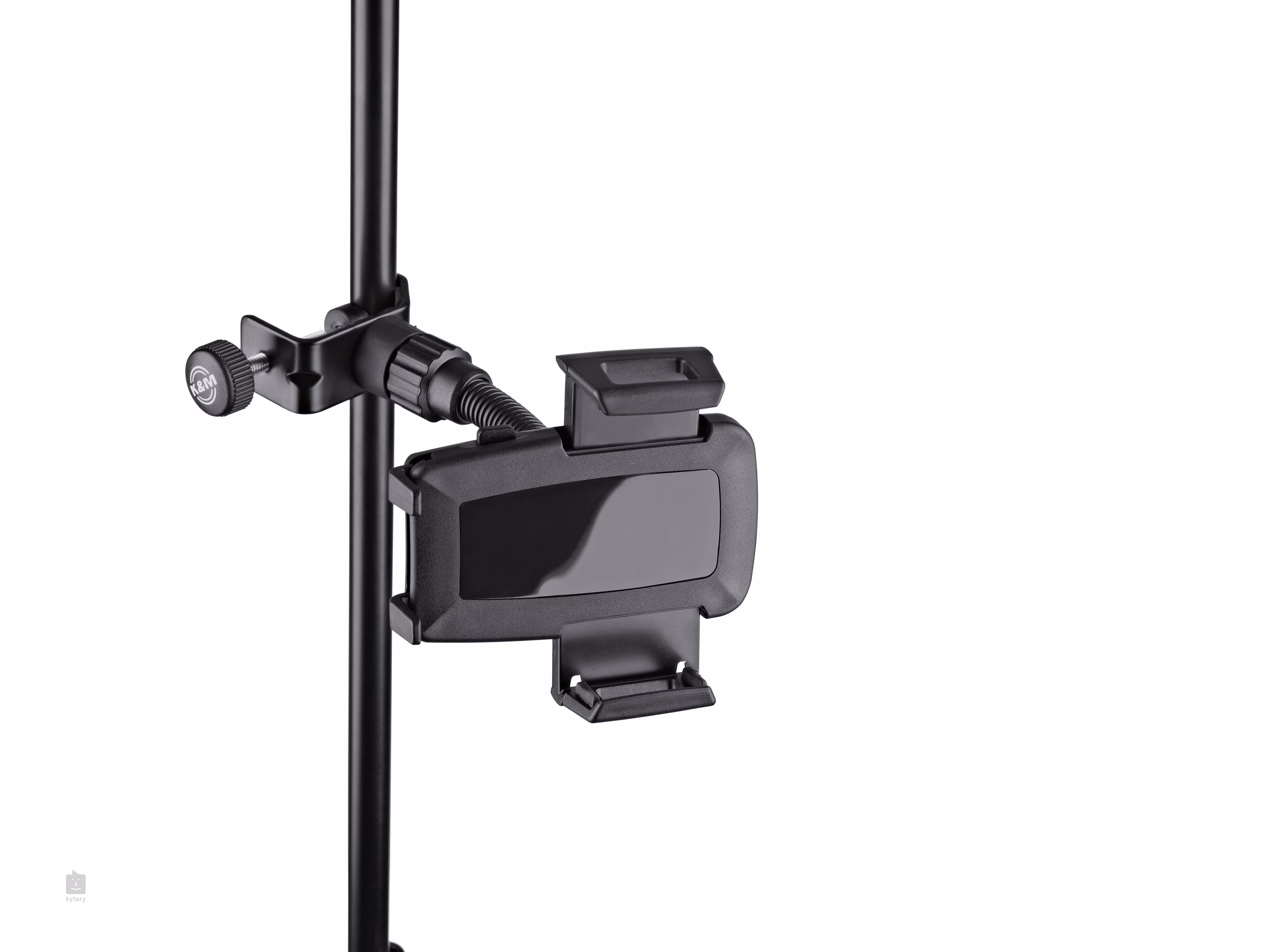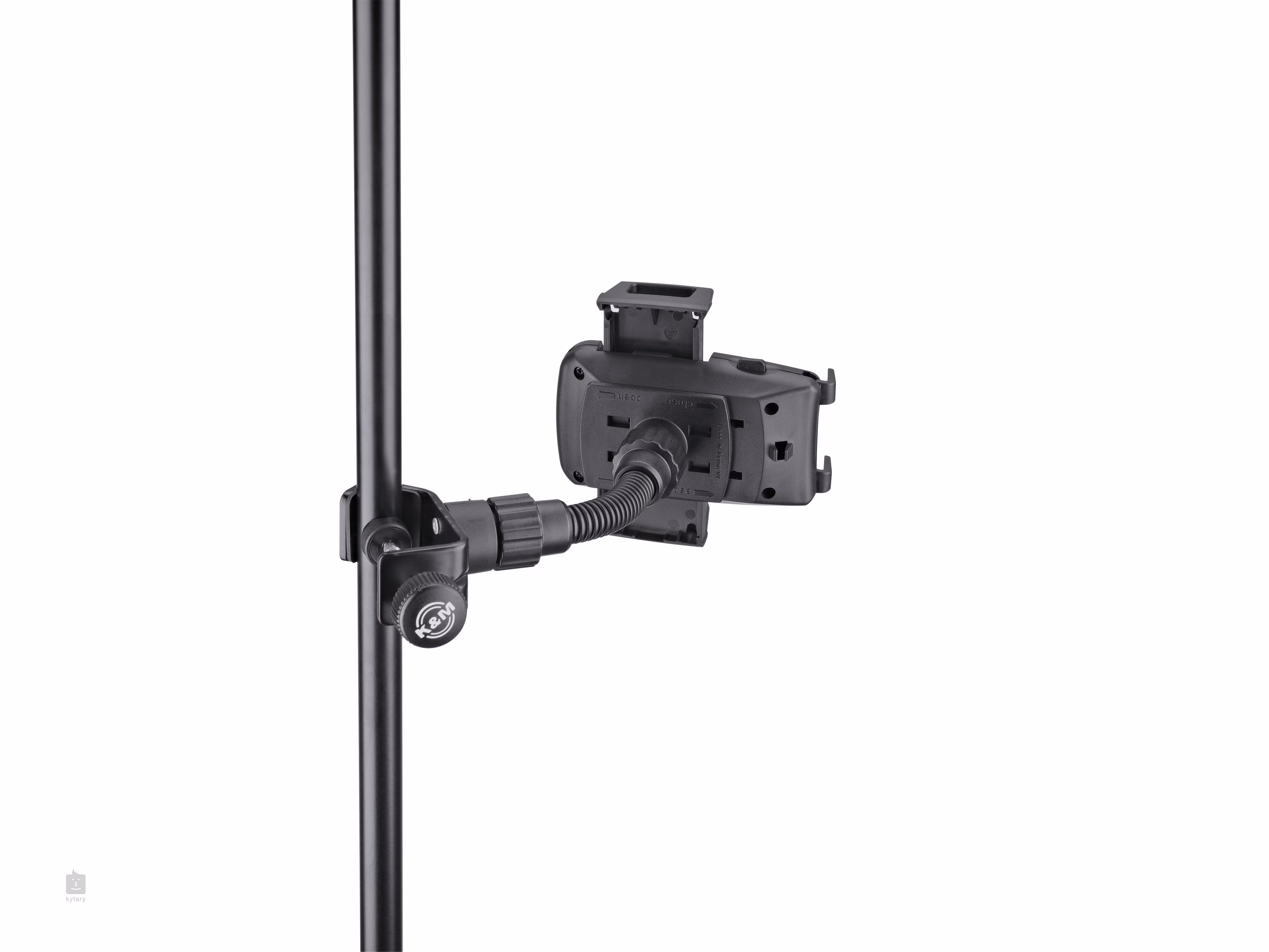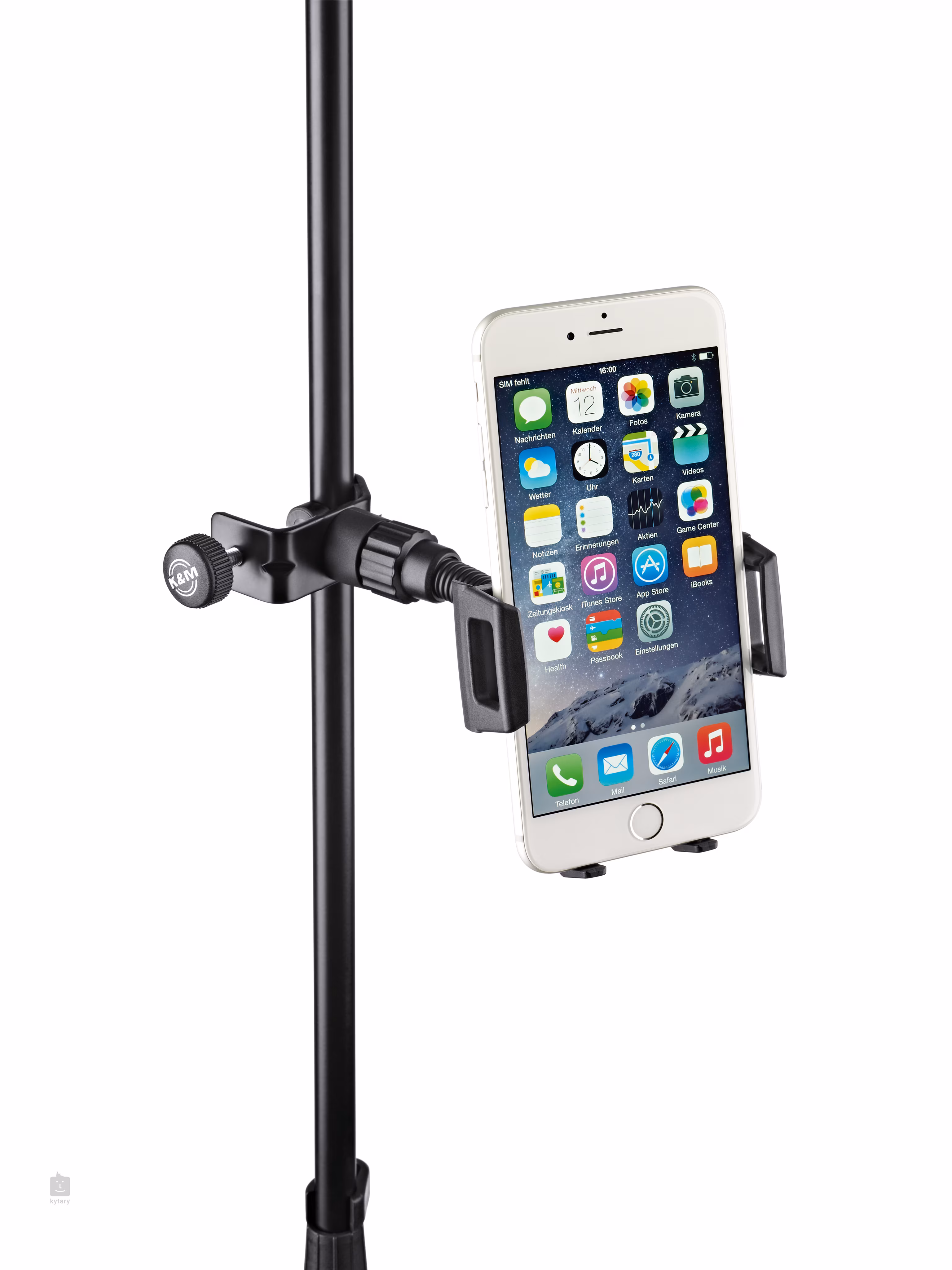 Univerzální držák smartphonů, iPodů a mp3 přehrávačů na mikrofonní stojan vám umožní maximálně využít potenciál vašeho zařízení při live performance nebo studiových session. Můžete například využívat hudební aplikace pro zpěv, hudební nástroj nebo jen zobrazit poznámky, text či akordy skladby. Držák disponuje nastavitelnou konstrukcí pro co nejoptimálnější využití, husím krkem pro vhodné nastavení sklonu a 30mm závitem s robustním úchytem.