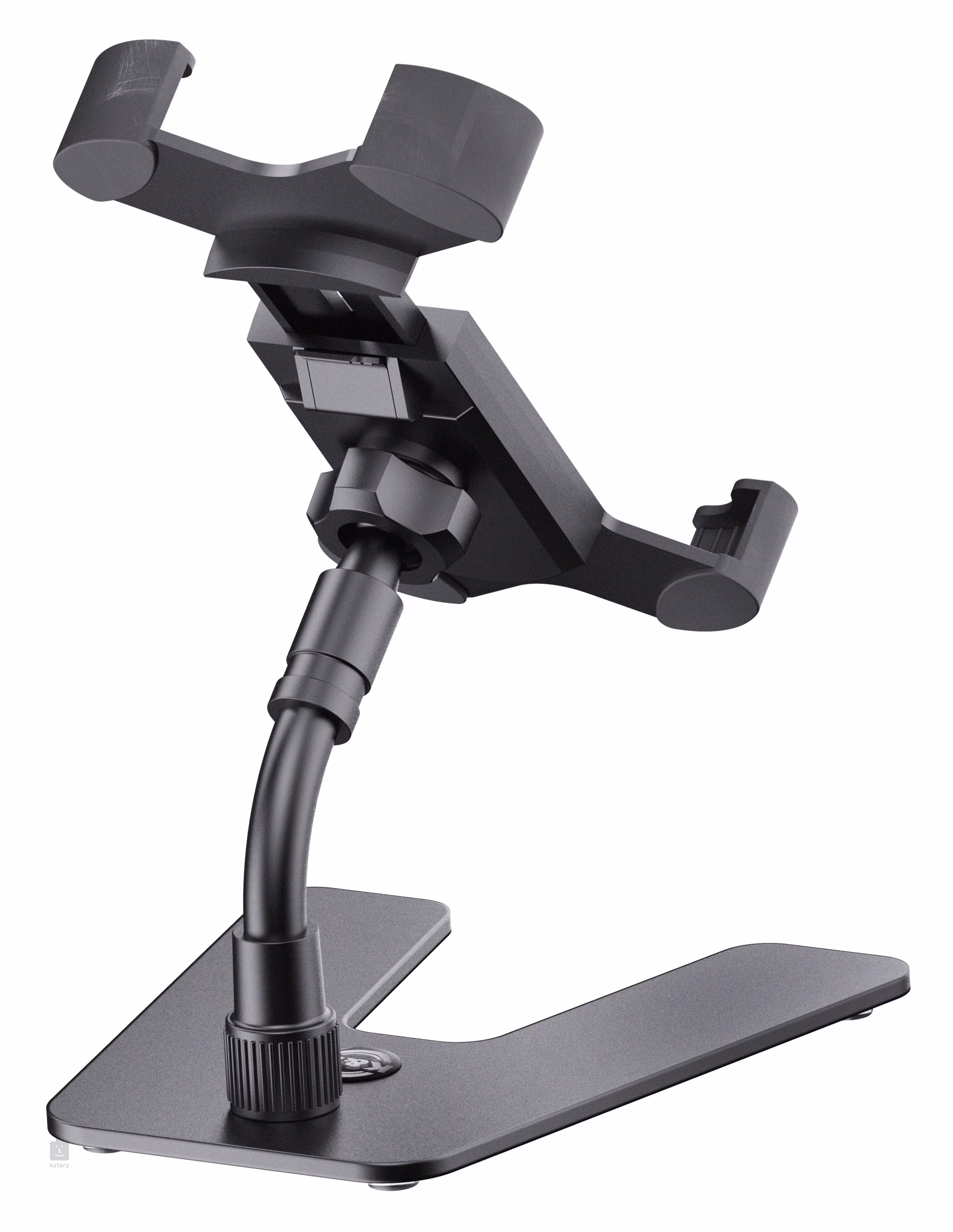 Univerzální držák smartphonů, iPodů a mp3 přehrávačů o šířce v rozmezí 55 a 85 milimetrů. Prostřednictvím 3/8“ závitu držák snadno připevníte na desktopový stojan, který je součástí balení nebo na klasický mikrofonní stojan, čímž vám umožní maximálně využít potenciál vašeho zařízení při live performance nebo studiových session. Můžete například využívat hudební aplikace pro zpěv, hudební nástroj nebo jen zobrazit poznámky, text či akordy skladby. Držák disponuje nastavitelnou konstrukcí pro co nejoptimálnější využití a možností otáčení o 360 stupňů.