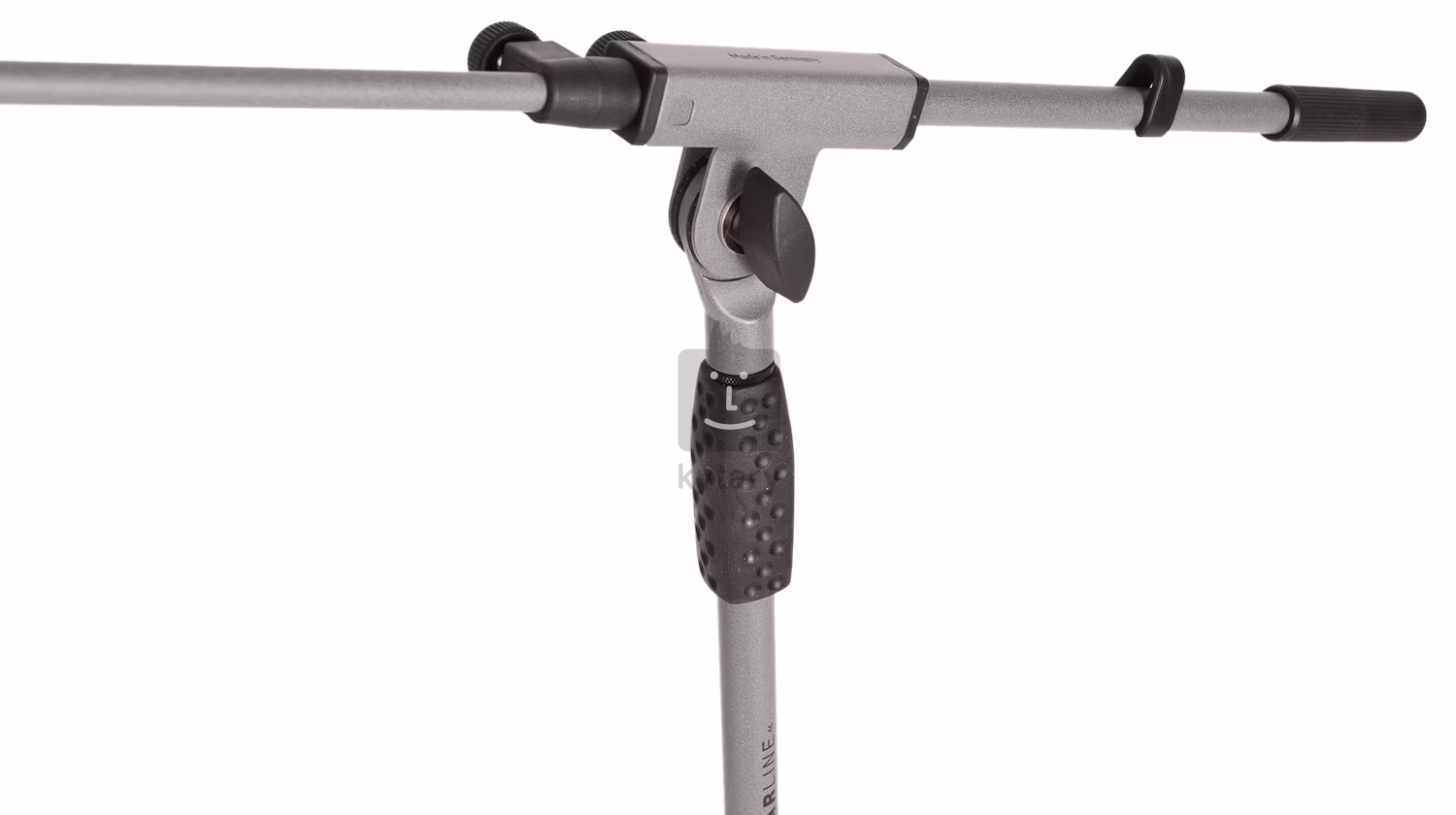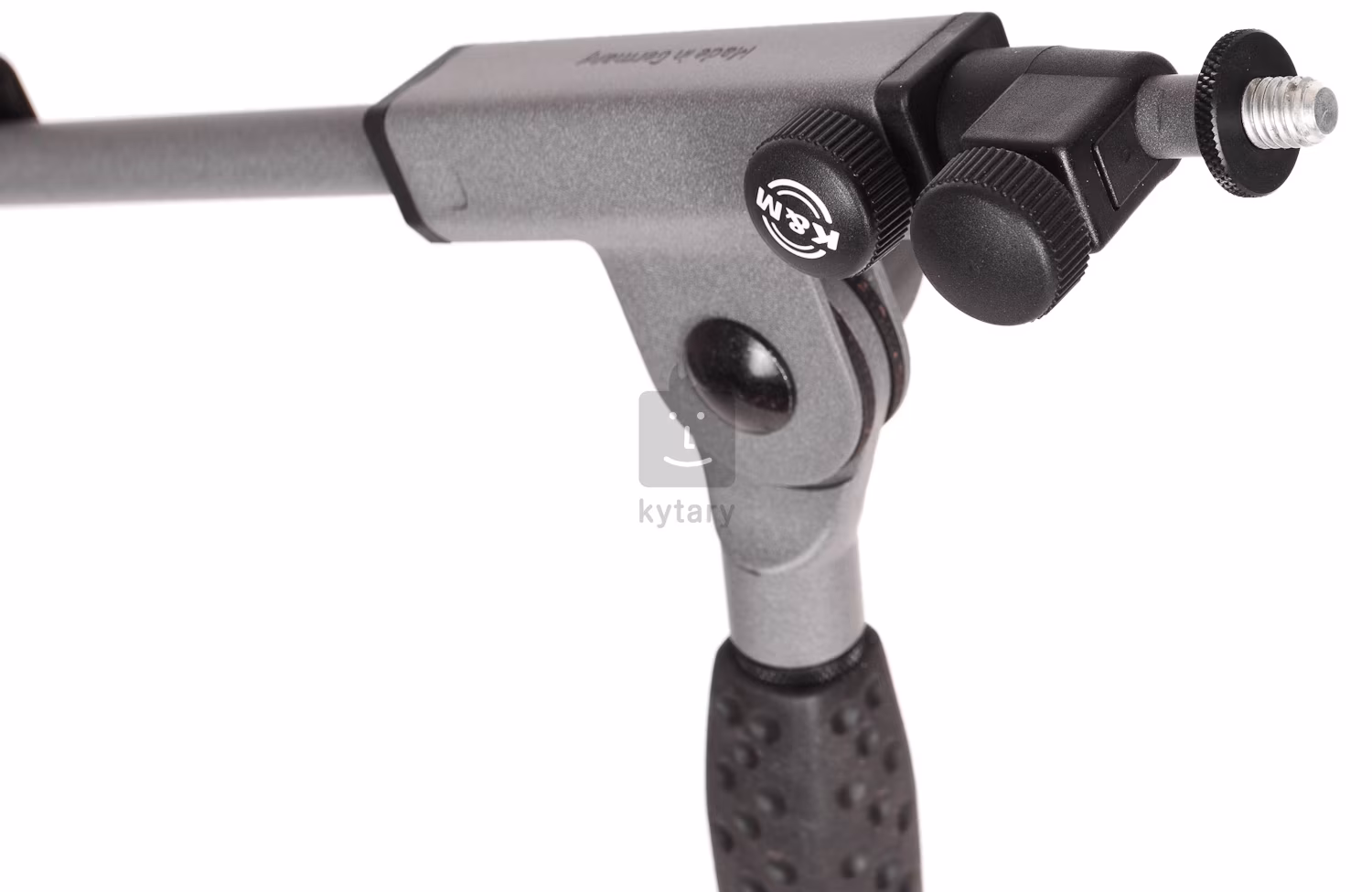 Mikrofonní stojan s teleskopickým ramenem v šedé barvě.