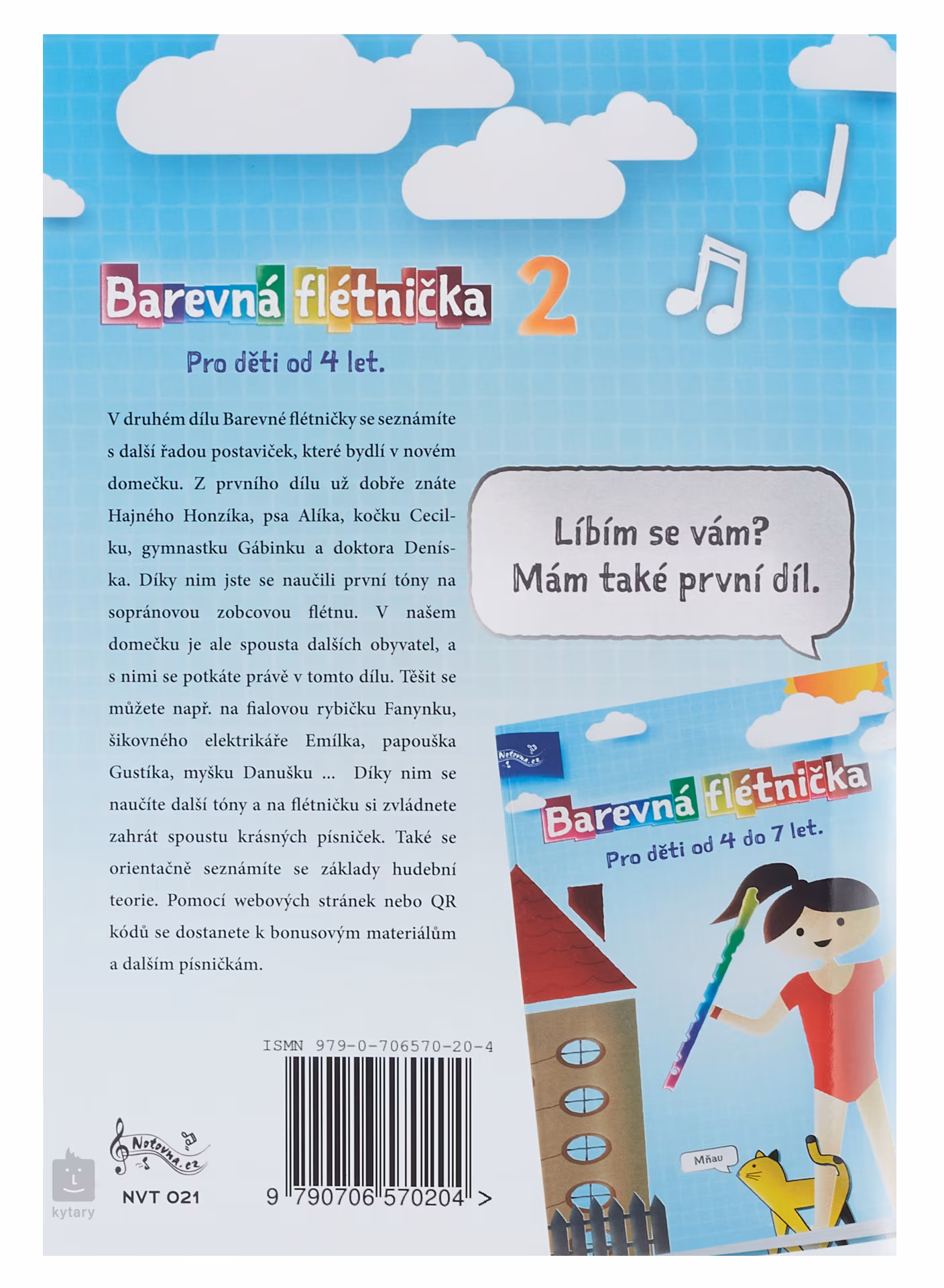 V druhém dílu Barevné flétničky se seznámíte s další řadou postaviček, které bydlí v novém domečku. Z prvního dílu už dobře znáte Hajného Honzíka, psa Alíka, kočku Cecilku, gymnastku Gábinku a doktora Deníska. Díky nim jste se naučili první tóny na sopránovou zobcovou flétnu. V našem domečku je ale spousta dalších obyvatel, a s nimi se potkáte právě v tomto dílu. Těšit se můžete např. na fialovou rybičku Fanynku, šikovného elektrikáře Emílka, papouška Gustíka, myšku Danušku... Díky nim se naučíte další tóny a na flétničku si zvládnete zahrát spoustu krásných písniček. Také se orientačně seznámíte se základy hudební teorie. Pomocí webových stránek nebo QR kódů se dostanete k bonusovým materiálům a dalším písničkám.