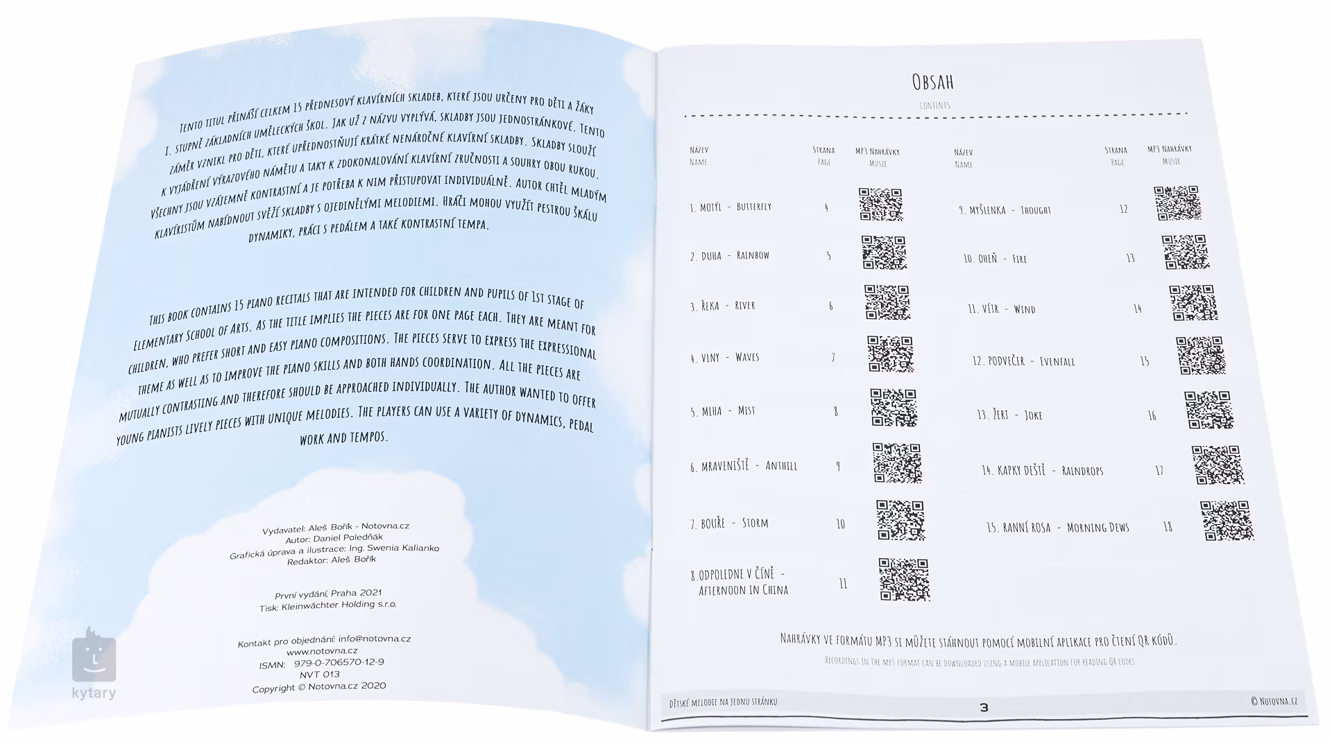Obsah: 1. MOTÝL / Butterfly 2. DUHA / Rainbow 3. ŘEKA / River 4. VLNY / Waves 5. MLHA / Mist 6. MRAVENIŠTĚ / Anthill 7. BOUŘE / Storm 8. ODPOLEDNE V ČÍNĚ / Afternoon in China 9. MYŠLENKA / Thought 10. OHEŇ / Fire 11. VÍTR / Wind 12. PODVEČER / Evenfall 13. ŽERT / Joke 14. KAPKY DEŠTĚ / Raindrops 15. RANNÍ ROSA / Morning Dews