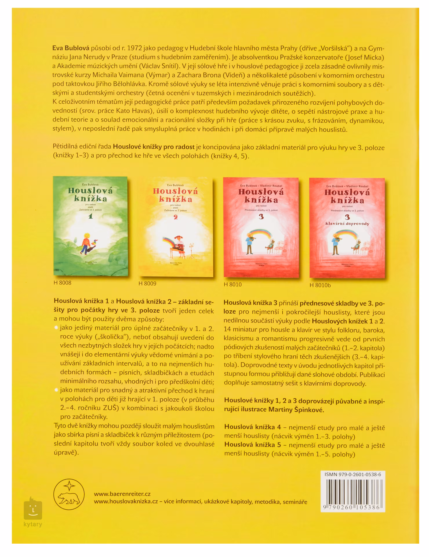 Houslová knížka 3 přináší přednesové skladby ve 3. poloze pro nejmenší i pokročilejší houslisty, které jsou nedílnou součástí výuky podle Houslových knížek 1 a 2. 14 miniatur pro housle a klavír ve stylu folkloru, baroka, klasicismu a romantismu progresivně vede od prvních pódiových zkušeností malých začátečníků (1.-2. kapitola) po tříbení stylového hraní těch zkušenějších (3.-4. kapitola). Doprovodné texty v úvodu jednotlivých kapitol přístupnou formou přibližují dané slohové období. Publikaci doplňuje samostatný sešit s klavírními doprovody (H 8010b). Houslové knížky 1, 2 a 3 doprovázejí půvabné a inspirující ilustrace Martiny Špinkové.