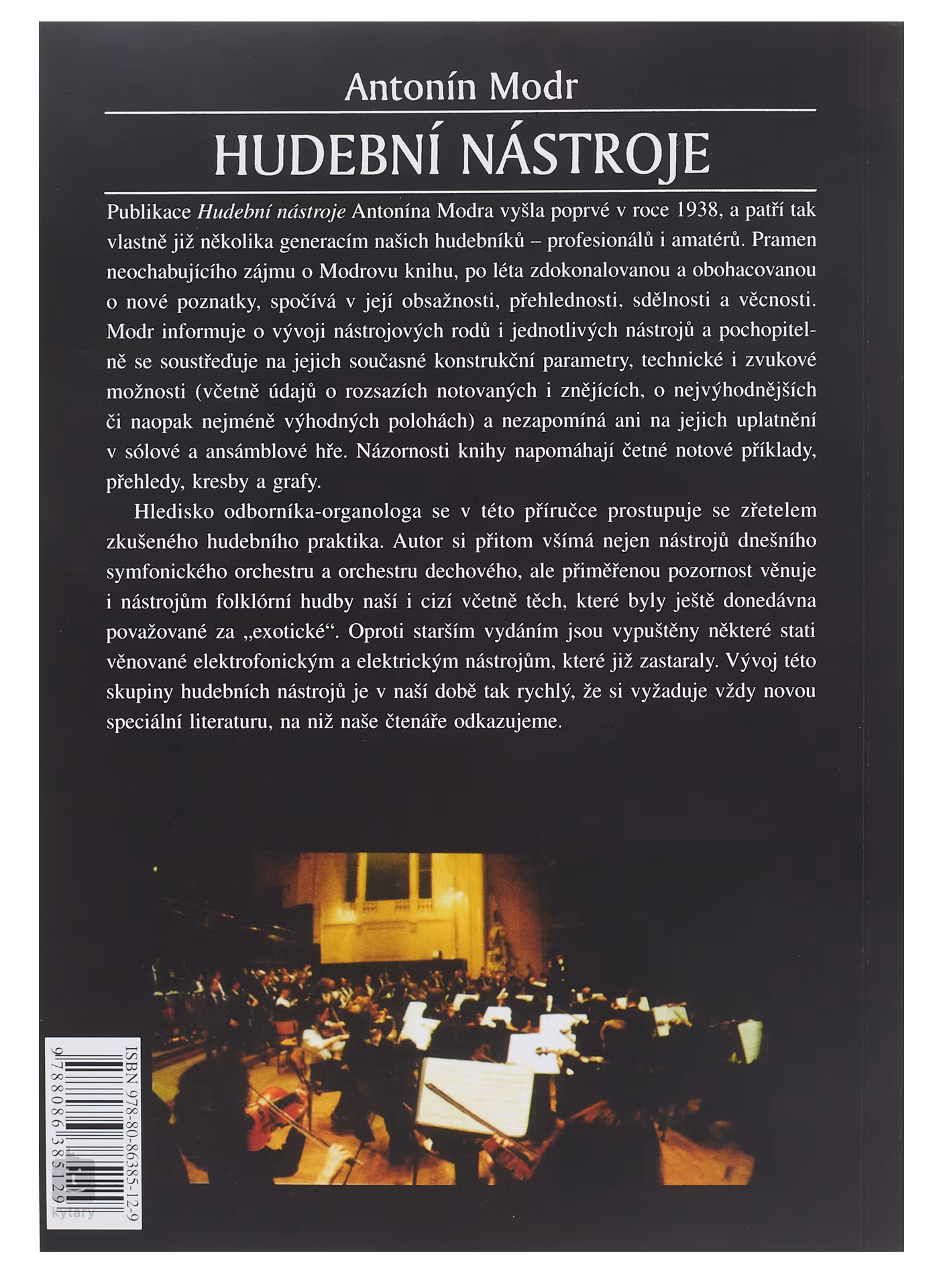 Publikace Hudební nástroje profesora Antonína Modra vyšla poprvé v roce 1938 a patří tak vlastně již několika generacím našich hudebníků - profesionálů i amatérů. Pramen neochabujícího zájmu o Modrovu knihu, po léta zdokonalovanou a obohacovanou o nové poznatky, záleží v její obsažnosti, přehlednosti, sdělnosti a věcnosti. Modr informuje o vývoji nástrojových rodů i jednotlivých nástrojů a pochopitelně se soustřeďuje na jejich současné konstrukční parametry, technické i zvukové možnosti (včetně údajů o rozsazích notovaných i znějících, o nejvýhodnějších či naopak nejméně výhodných polohách) a nezapomíná ani na jejich uplatnění v sólové a ansámblové hře. Názornost a sdělnost Modrovy práce zvyšují četné notové příklady, přehledy, kresby a grafy. Hledisko odborníka - organologa se v Modrově knize prostupuje se zřetelem zkušeného hudebního praktika. Autor si přitom všímá nejen nástrojů dnešního symfonického orchestru a orchestru dechového, ale přiměřenou pozornost věnuje i nástrojům folklórní hudby naší i cizí včetně nástrojů donedávna ještě považovaných za exotické. Oproti starším vydáním jsou vypuštěny některé stati věnované elektrofonickým a elektronickým nástrojům, které již zastaraly. Vývoj této skupiny hudebních nástrojů je v naší době tak rychlý, že si vyžaduje vždy novou speciální literaturu, na niž naše čtenáře odkazujeme.
