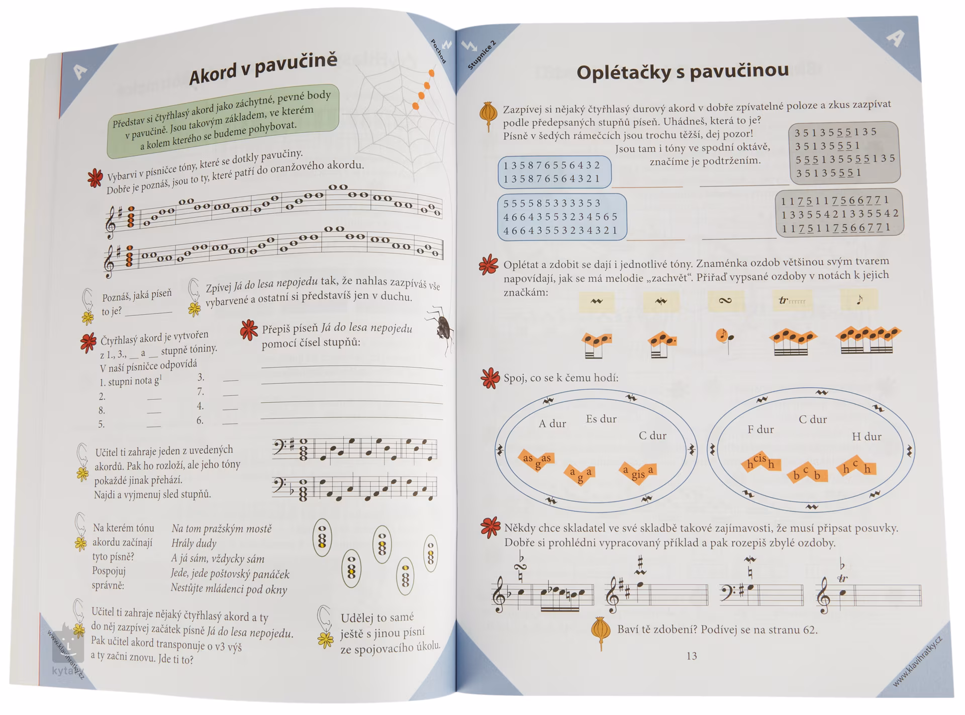 Barevně ilustrované sešity pro malé klavíristy sestavené z pracovních listů s množstvím hudebních úkolů k doplňování, spojování, vybarvování, vystřihování a řadou sluchových cvičení