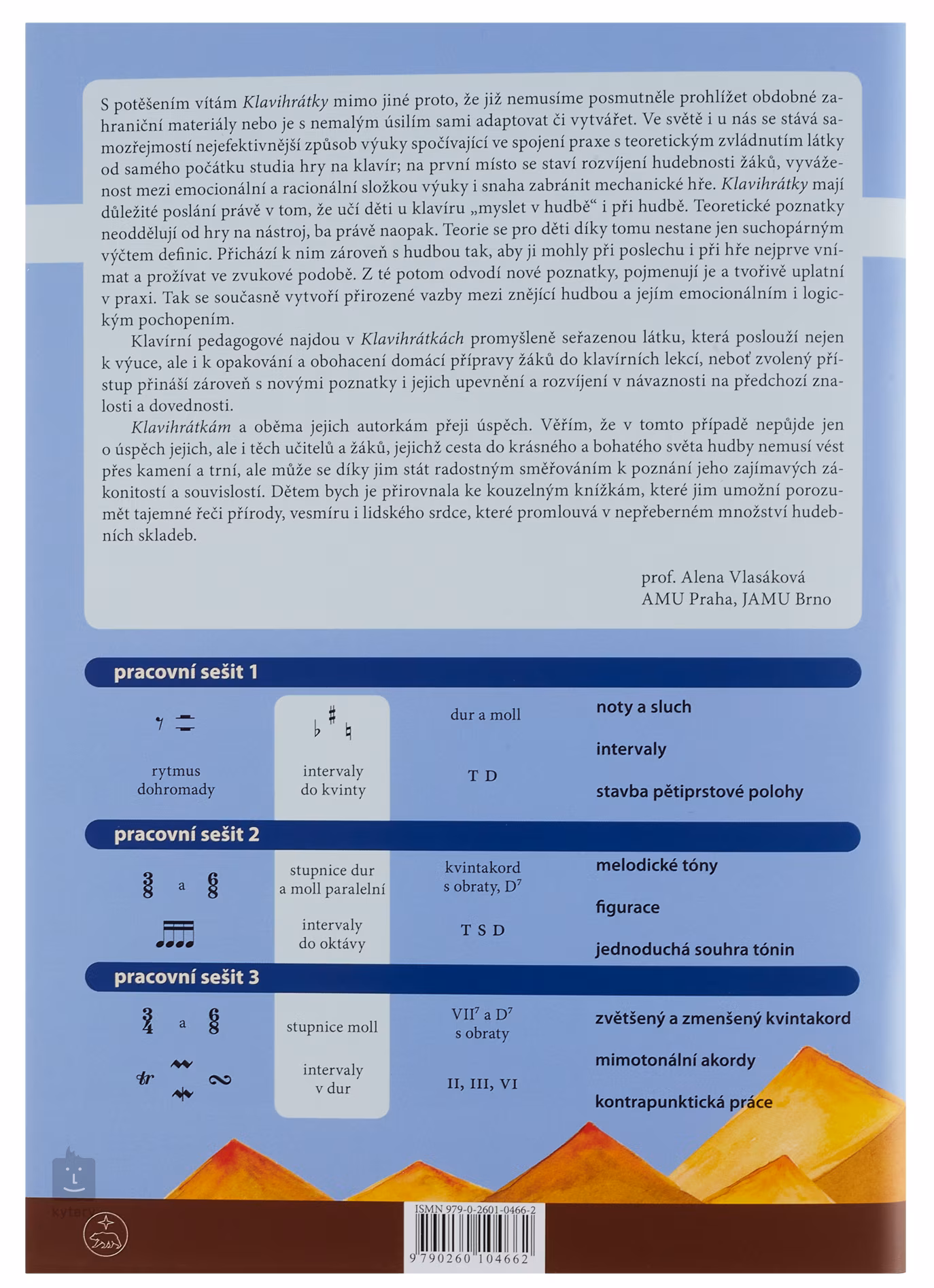 Úspěšná série čtyř pracovních sešitů pro mladé klavíristy je moderním, nápaditým a promyšleným učebním materiálem, sledujícím současné mezinárodní trendy ve vývoji metodiky. Systematicky utříděné sborníky podnětů a nápadů k hodinám hry na klavír využije každý pedagog podle svých potřeb a individuálních možností dítěte. Hudební teorie se učí přímo u klavíru, s tužkou v ruce a ve spojení s praktickým použitím daného problému. Nápaditá kreslená cvičení dětem přiblíží tónový prostor a souvislosti v něm. Hravou, názornou a lehce srozumitelnou formu učení ocení i rodiče-nehudebníci. Snaha rozvíjet hudebnost dítěte jako celek, začlenit hudebně teoretické poznatky do výuky hry na nástroj a vyvážit racionální a emocionální složku hudebního vzdělávání - to vše jsou hlavní jmenovatele Klavihrátek.