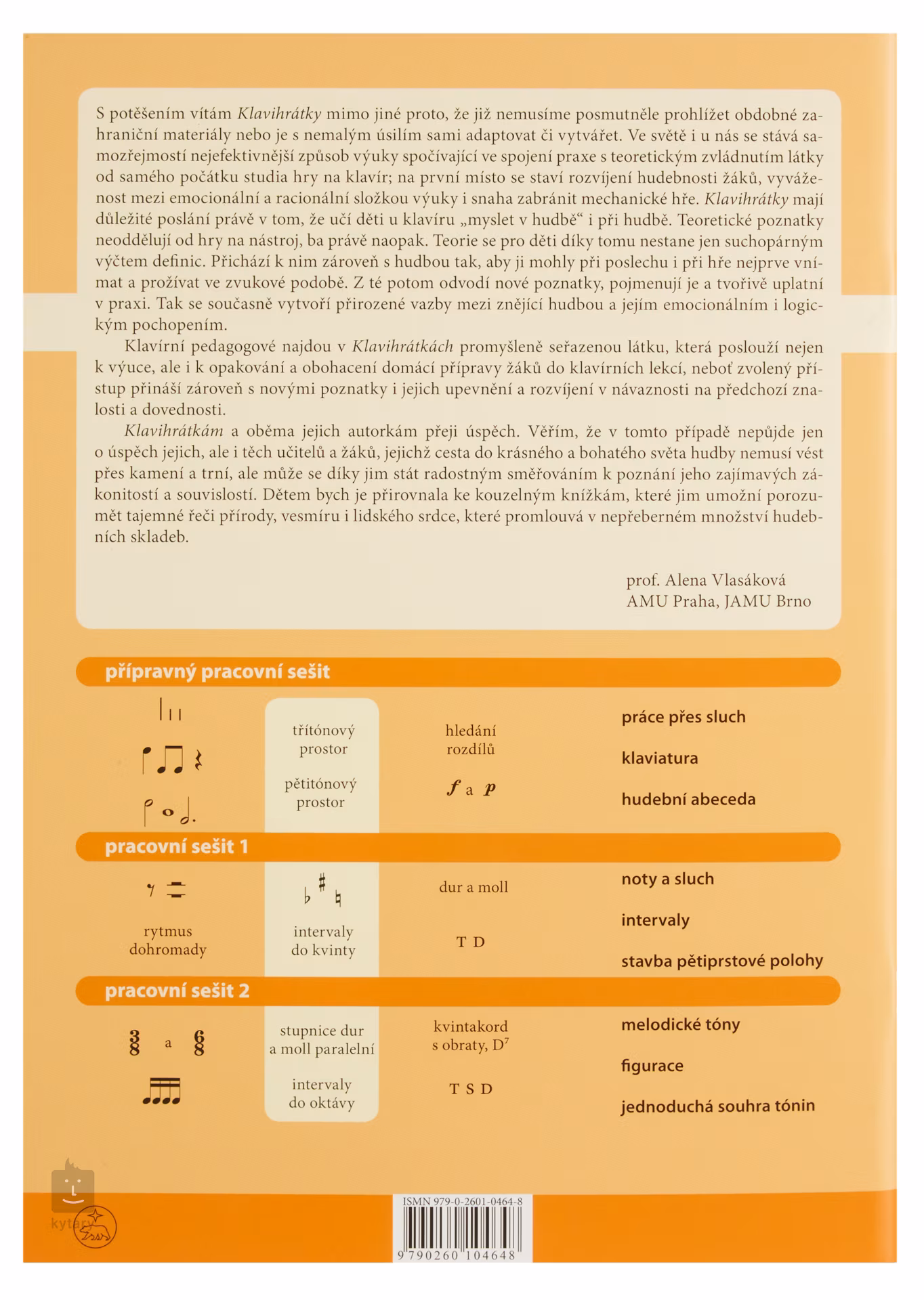 Úspěšná série čtyř pracovních sešitů pro mladé klavíristy je moderním, nápaditým a promyšleným učebním materiálem, sledujícím současné mezinárodní trendy ve vývoji metodiky. Systematicky utříděné sborníky podnětů a nápadů k hodinám hry na klavír využije každý pedagog podle svých potřeb a individuálních možností dítěte. Hudební teorie se učí přímo u klavíru, s tužkou v ruce a ve spojení s praktickým použitím daného problému. Nápaditá kreslená cvičení dětem přiblíží tónový prostor a souvislosti v něm. Hravou, názornou a lehce srozumitelnou formu učení ocení i rodiče-nehudebníci. Snaha rozvíjet hudebnost dítěte jako celek, začlenit hudebně teoretické poznatky do výuky hry na nástroj a vyvážit racionální a emocionální složku hudebního vzdělávání - to vše jsou hlavní jmenovatele Klavihrátek.
