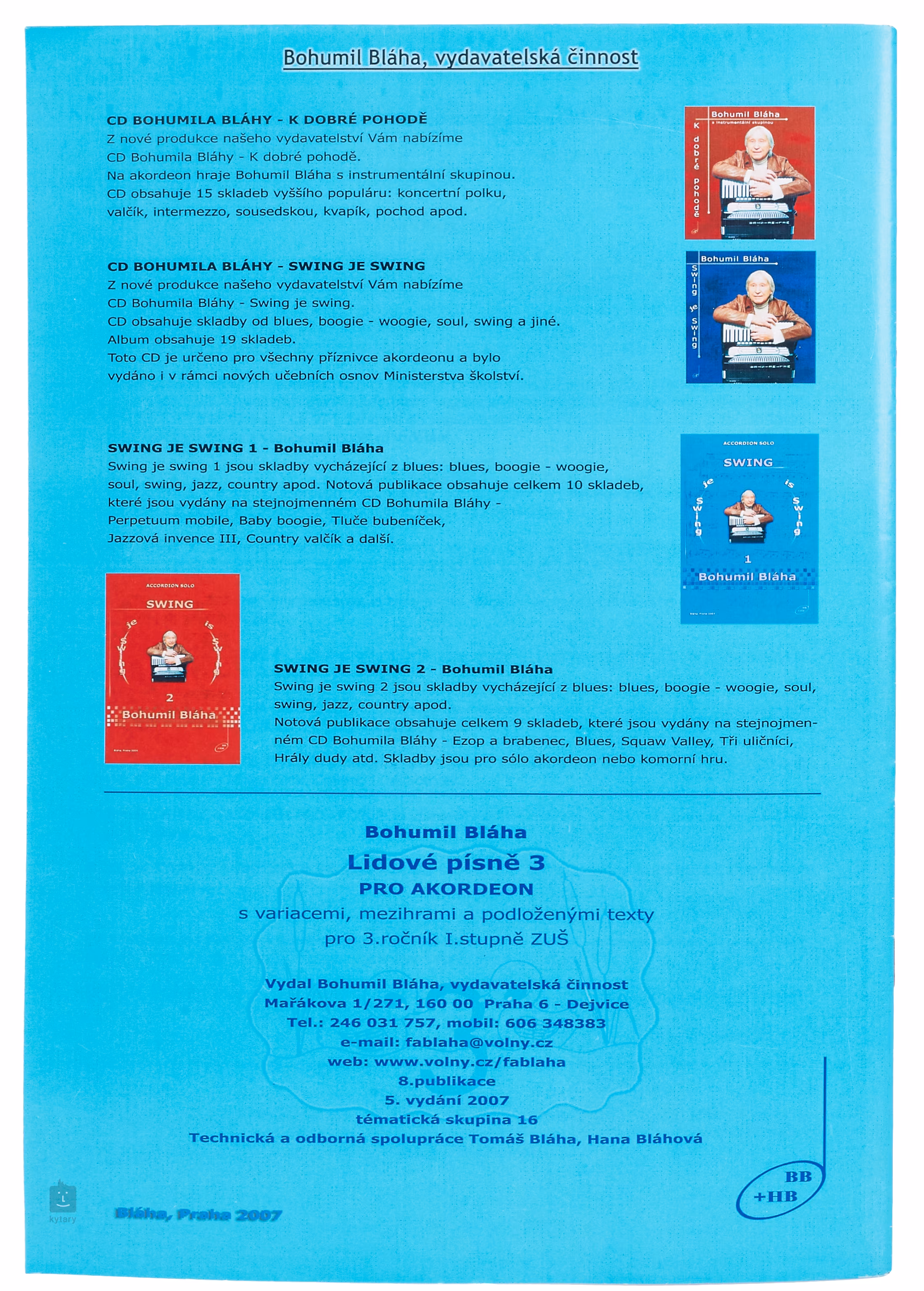 Publikace Lidové písně 3 nabízí dvacet českých, moravských, slezských a slovenských písní pro žáky 3-4. ročníku ZUŠ v úpravě pro akordeon. Lze též použít pro zpěv a kytaru, klávesy (klavír) nebo zobcovou sopránovou flétnu.