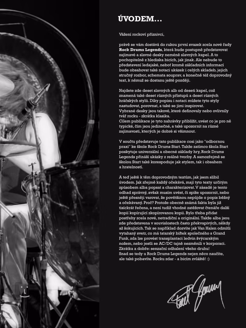 Škola hry na bicí ROCK DRUMS LEGENDS představuje ideální doplněk ke škole ROCK DRUMS / START. Obsahuje ukázky a transkripce známých skladeb od slavných kapel (Kiss, Deep Purple, Yes, Van Halen, Bad Company, Jeff Beck, Grand Funk, AC/DC, Aerosmith), popisy skladeb (z pohledu bicích), doprovodné texty, profily hráčů, schémata souprav a další zajímavosti.