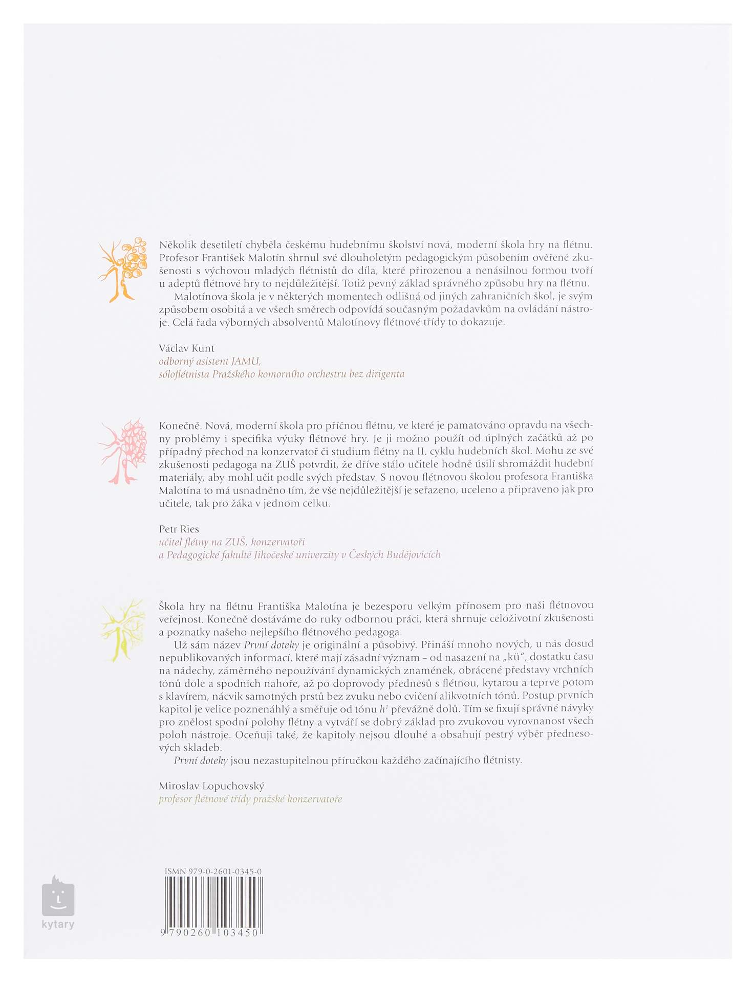 Na český trh konečně přichází nová moderní učebnice hry na příčnou flétnu První doteky profesora Františka Malotína. Přináší možnost systematické práce se začátečníky flétnové hry, ale je ji možno využít po celou dobu studia flétny v ZUŠ. V učebnici lze nalézt mnoho cvičení pro postupný rozvoj hráčské techniky, ale především pro vytváření vysoké tónové kultury, i pestrý výběr přednesových skladeb s doprovodem druhé flétny, kytary nebo klavíru. Je zde celá řada vynikajících a v Čechách dosud nepublikovaných poznatků a informací, jako je zahájení každého cvičení dlouhou notou, způsob zapojování nových tónů, obrácená představa vrchních tónů dole a spodních nahoře, důsledné trvání na správném nasazování a uvolňování krku, důsledné značení nádechů a dostatek času na nádechy pro rozvoj správné dechové techniky, zařazení cvičení s alikvotními tóny nebo cvičení pouze klapáním prsty bez zvuku. Učebnice je velice přehledně graficky vypravena a hudební úkoly provázejí krásné a inspirativní ilustrace. Vyšla za finanční podpory Českého hudebního fondu.
