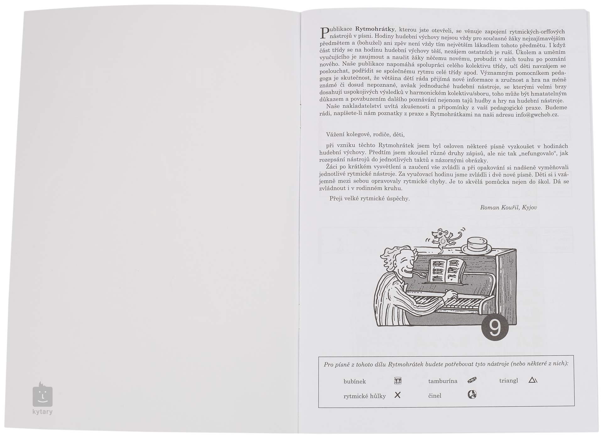 Tato publikace se věnuje zapojení rytmických nástrojů do písní. Jak dobře víme, z rytmických nástrojů se v rukou dětí stávají „zbraní“ – bubínkem se dá bouchat soused v lavici do hlavy nebo ozvučnými dřívky popichovat kamaráda do zad. Je moc důležité zaujmout žáky, aby tomu tak nebylo. Při vzniku těchto Rytmohrátek jsem mohl některé písně vyzkoušet v hodinách hudební výchovy. Předtím jsem zkoušel různé druhy zápisů, ale nic tak nefungovalo, jako rozepsání nástrojů do jednotlivých taktů v Rytmohrátkách, s názornými obrázky. Žáci po krátkém vysvětlení vše zvládli a při opakování si nadšeně prohazovali jednotlivé rytmické nástroje. Za vyučovací hodinu jsme zvládli i dvě písně. Děti si i vzájemně mezi sebou opravovaly rytmické chyby. Je to skvělá pomůcka nejen do škol. Dá se zvládnout i v rodinném kruhu. Přeji velké rytmické úspěchy.