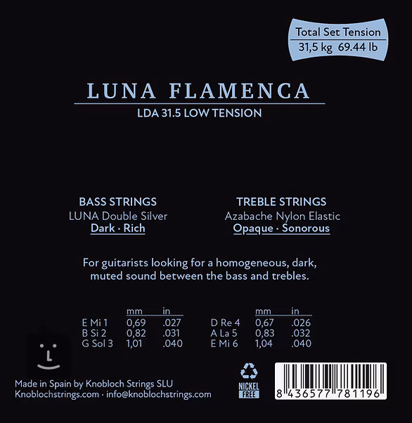 Řada flamencových strun LUNA FLAMENCA od společnosti Knobloch představuje výjimečně kvalitní struny pro klasickou kytaru určené speciálně pro hráče flamenca. Basové struny z dvojitého stříbra Luna mají mohutný, hluboký tón, který vytváří tajemnou atmosféru, zatímco vysoké nevinuté struny vyrobené z AZ nylonu jsou hutné a bohaté. Výsledkem jsou zvučné struny s temnějším zvukovým charakterem, který se skvěle hodí pro styl, pro který byly vytvořeny.