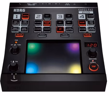 Jak již jméno "Quad" napovídá, tento nový Kaoss Pad umožňuje využívat až čtyři efekty současně. Tyto efekty lze synchronizovat k rytmu hudby a libovolně transformovat song v reálném čase. Zpracovat můžete jakýkoliv zdroj audio signálu, z MP3 přehrávače, konzoly mixu, nástroje, dokonce i vokály z mikrofonu! Potenciál možností práce s výrazem u Kaoss Pad Quad zanechává veškeré konkurenční procesory dalece za sebou a rychle dobývá hájemství "nástrojů". Prosvícení ostrého a barevného LED touchpadu dodává silný dojem a individualitu, a ještě více tak posiluje jedinečný charakter Kaoss Pad Quad.