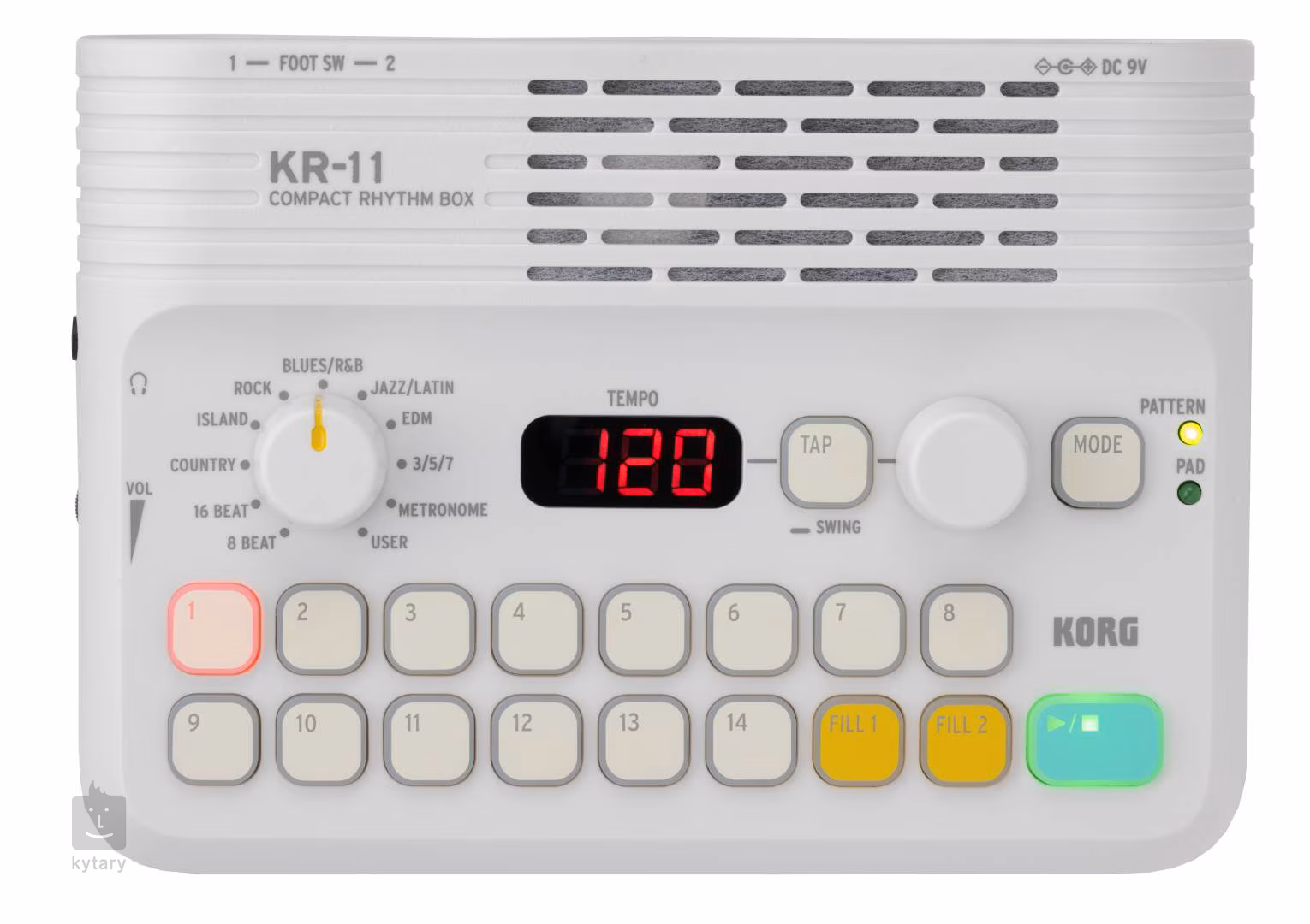 Korg KR-11 Rhythm Box je kompaktní rytmický automat, který přináší zábavu a variabilitu do každého cvičení a hudebního vystoupení. Díky mnoha rytmickým patternům v různých žánrech od blues a R&B přes country až po jedinečné tří- a pětiúderové patterny nabízí široké spektrum možností, a to i s možností upravit každý pattern a uložit až 14 vlastních. Jednoduché ovládání umožňuje rychlý výběr rytmů a spuštění stiskem tlačítka, což činí KR-11 snadno použitelným nástrojem pro každého hudebníka.