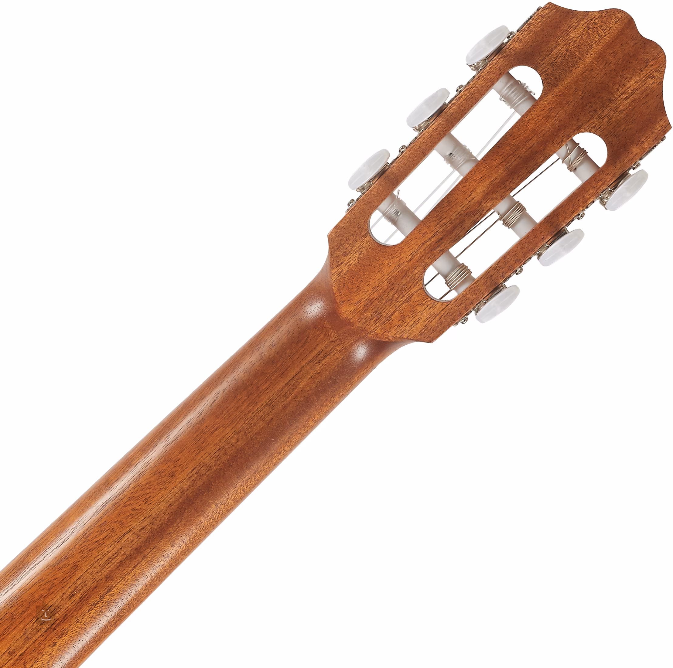 K mahagonovému krku je přilepen palisandrový hmatník. Struny jsou přes nultý a sedlový pražec z materiálu ABS uchyceny v niklových ladicích mechanikách a palisandrové kobylce. Pěkné zpracování podtrhuje obvodová lemovka a dekorativní dřevěná rozeta.
