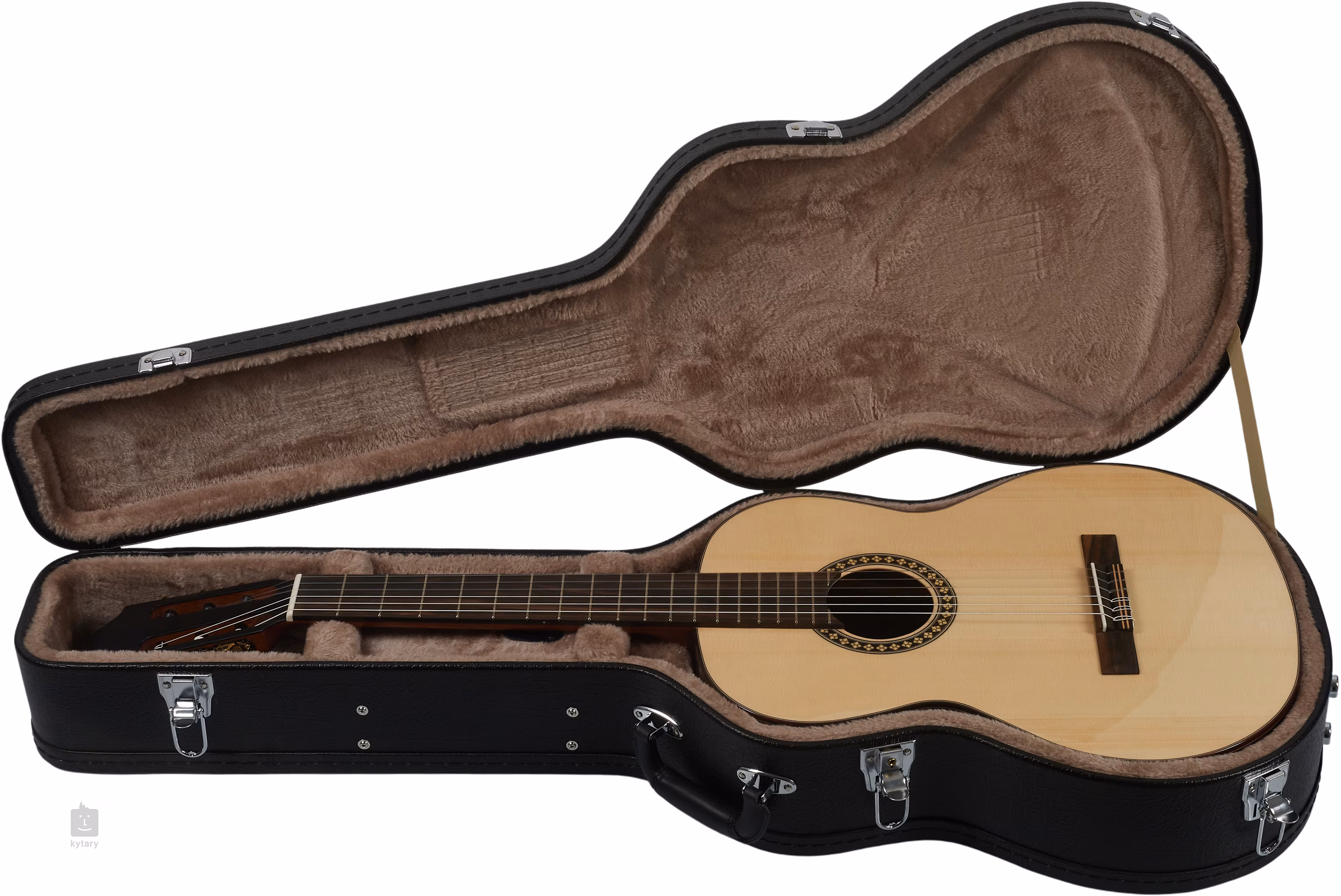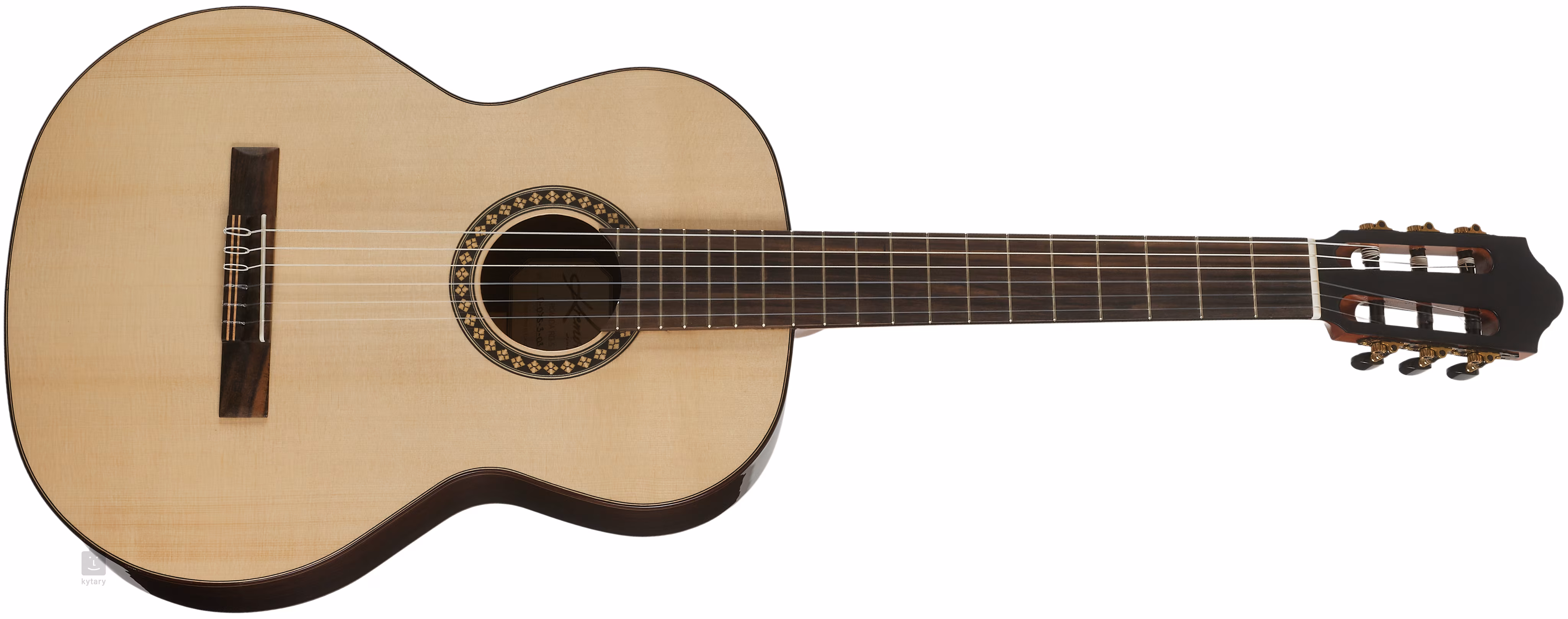 Struny jsou přes nultý a sedlový pražec z kosti uchyceny v mosazných ladicích mechanikách a ebenové kobylce. Pěkné zpracování podtrhuje dřevěná lemovka, palisandrová výložka a dekorativní rozeta.