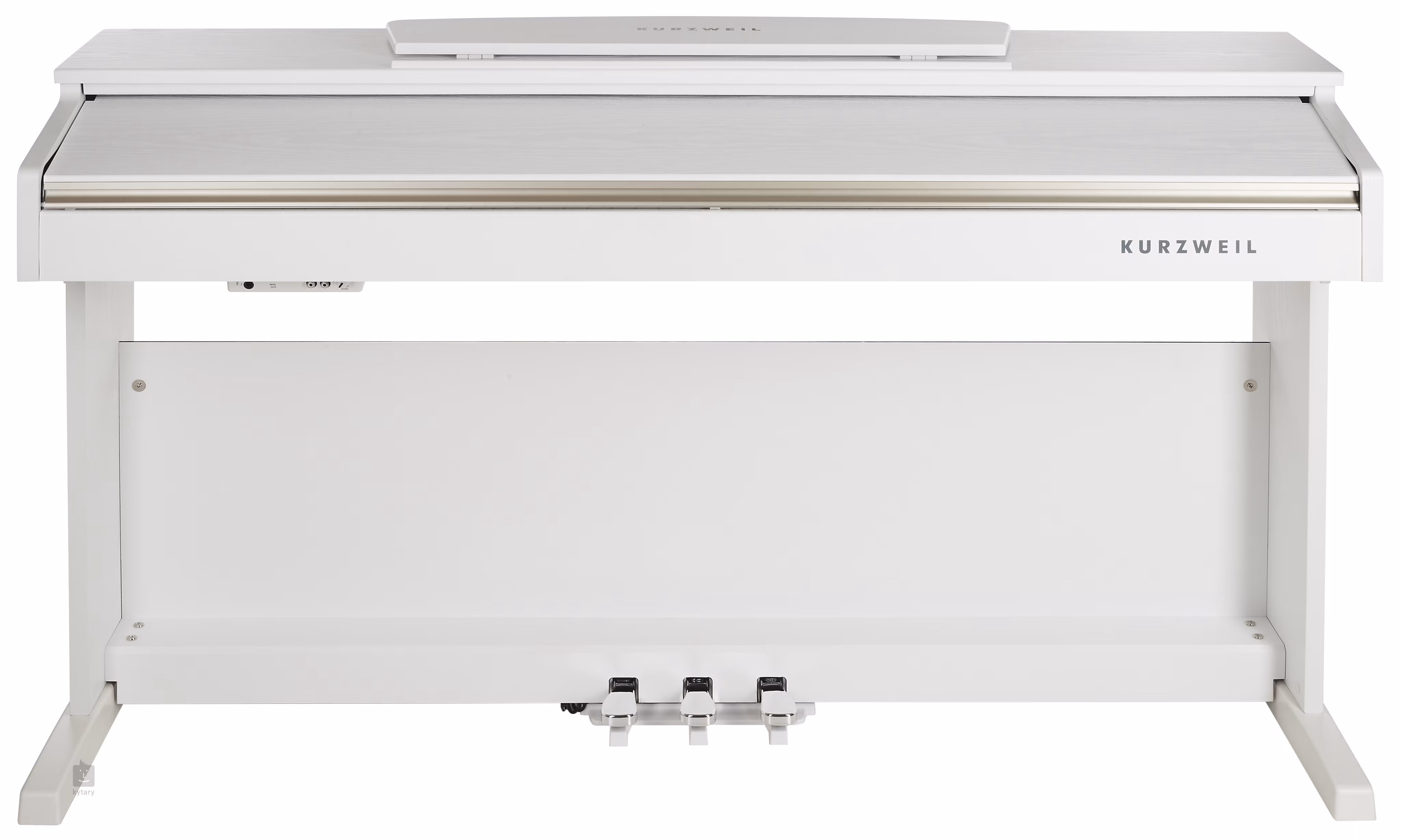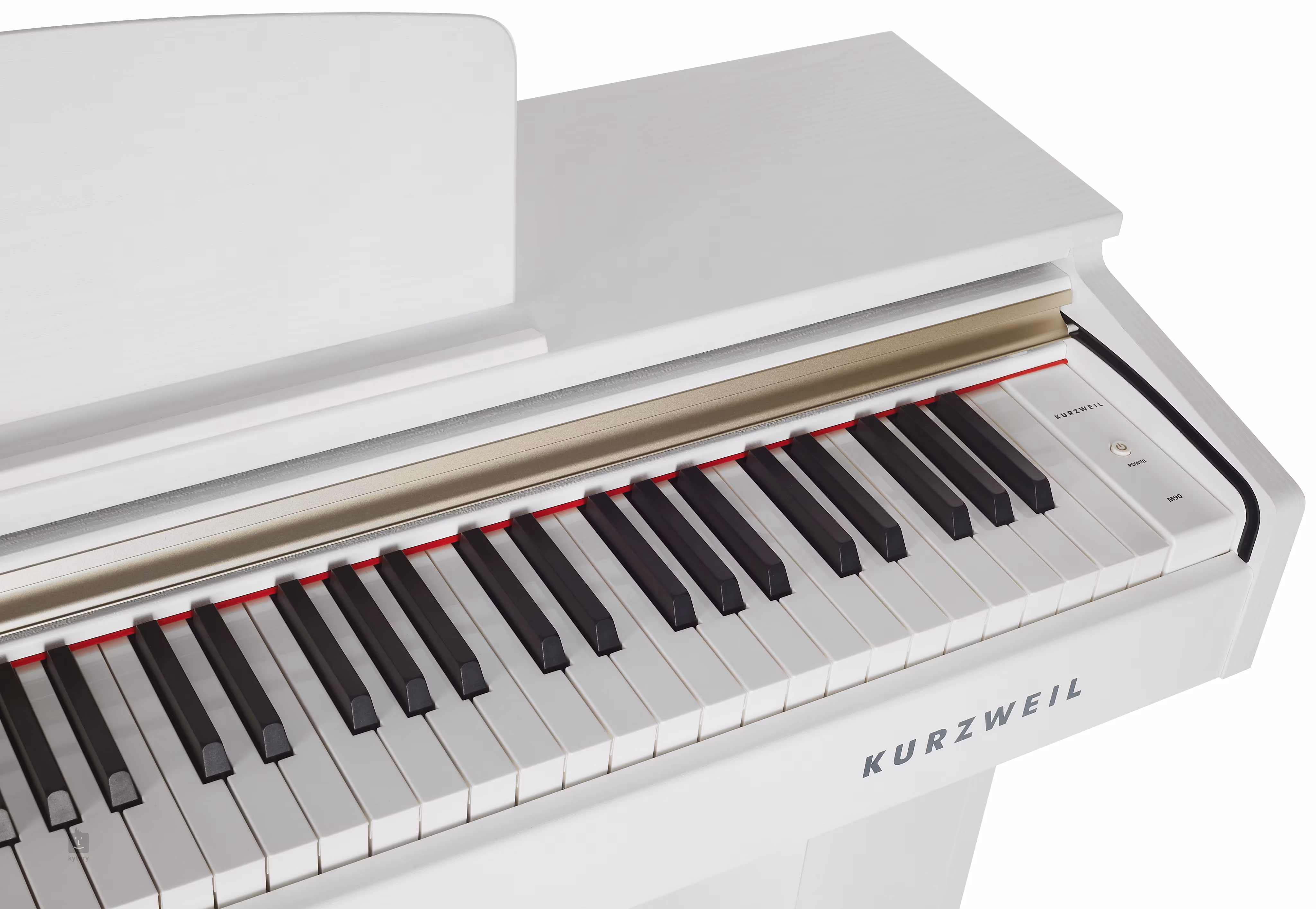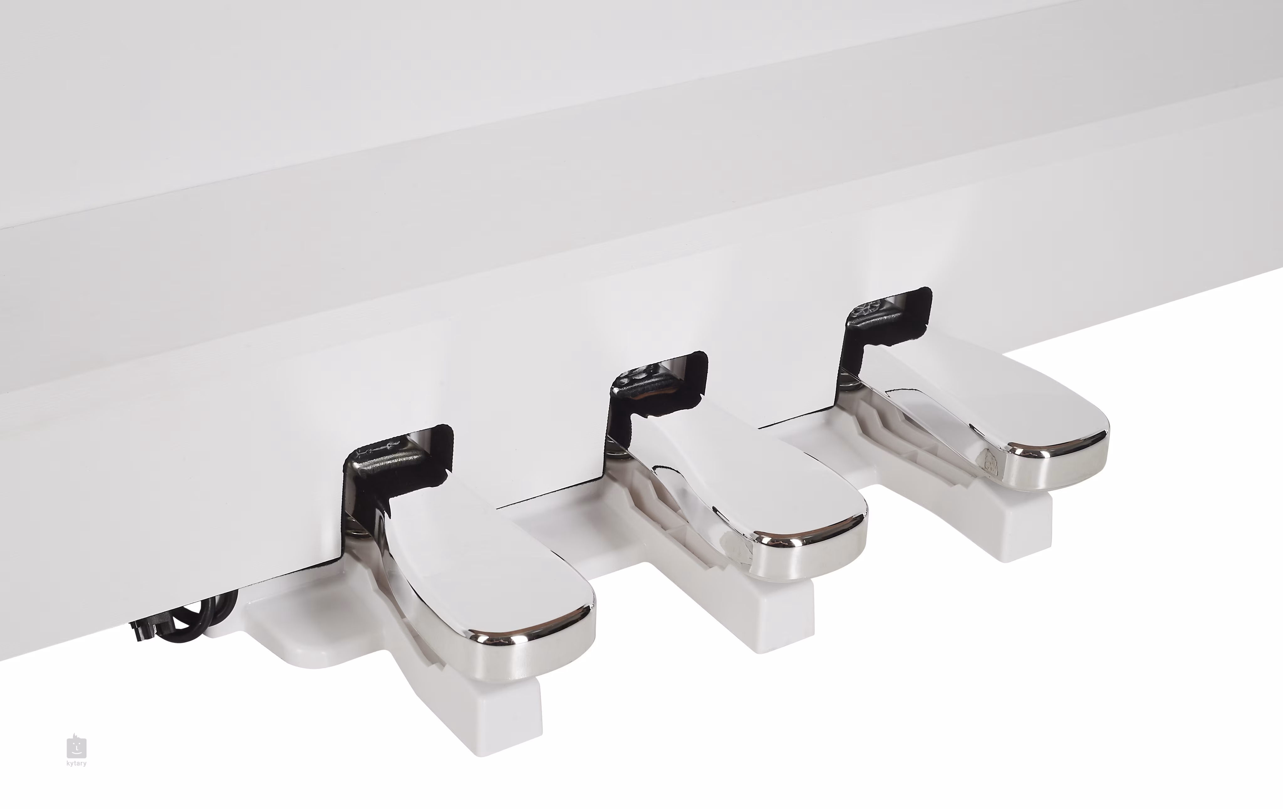 Digitální piano dále nabízí dva linkové RCA vstupy a výstupy, kompatibilitu s MIDI softwary ve vašem PC přes USB kabel, připojení dalšího MIDI zařízení pomocí MIDI OUT konektoru a dva výstupy do sluchátek pro tiché a nerušené cvičení. Povrchová úprava ve stylově bílé barvě vám doma ostudu jistě neudělá a prsty ochrání kryt klaviatury, který se zasunuje dovnitř. K napájení slouží 12V adaptér. Součástí balení je sustain/sostenuto/soft pedal a stolička.